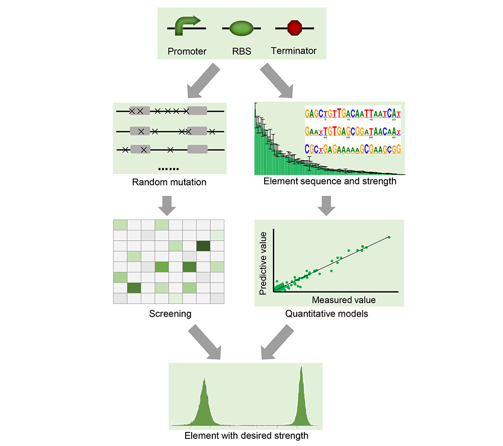 The cis-acting regulatory elements, e.g., promoters and ribosome binding sites (RBSs) with various desired properties, are building blocks widely used in synthetic biology for fine tuning gene expression. In the last decade, acquisition of a controllable regulatory element from a random library has been established and applied to control the protein expression and metabolic flux in different chassis cells. However, more rational strategies are still urgently needed to improve the efficiency and reduce the laborious screening and multifaceted characterizations. Building precise computational models that can predict the activity of regulatory elements and quantitatively design elements with desired strength have been demonstrated tremendous potentiality. Here, recent progress on construction of cis-acting regulatory element library and the quantitative predicting models for design of such elements are reviewed and discussed in detail.