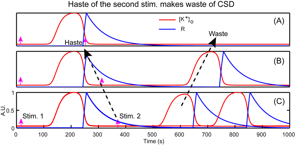 Cortical spreading depression (CSD) is an important experimental model for diseases such as stroke, epilepsy and migraine. Previous observations indicated that the amplitude and velocity of the typical direct current potential shift during repetitive CSD waves were varying. The recovery state of the tissue was found related with the variation of successive CSD waves. A computational model in this paper aimed to investigate the role of relative refractory period of CSD. This model simulated that continuous injection of KCl solution induced repetitive CSD waves. The first CSD wave often had a larger amplitude and faster velocity than those of the succeeding secondary waves. The relative refractory period lasted much longer than the recovery of ions turbulence. If the induction interval was long enough for recovery, a series of CSD waves would have the same profile as the first one. In the relative refractory period, an early stimulation might lead to a late initiation of CSD, i.e., “haste makes waste”. The amplitude and velocity of CSD waves were found increasing with the initiation interval and asymptotic to those of the first CSD wave. This study verified that the propagation dynamics of CSD waves is modulated by the relative refractory period. It suggested that the refractory period is critical for preventing undesirable CSD waves.
