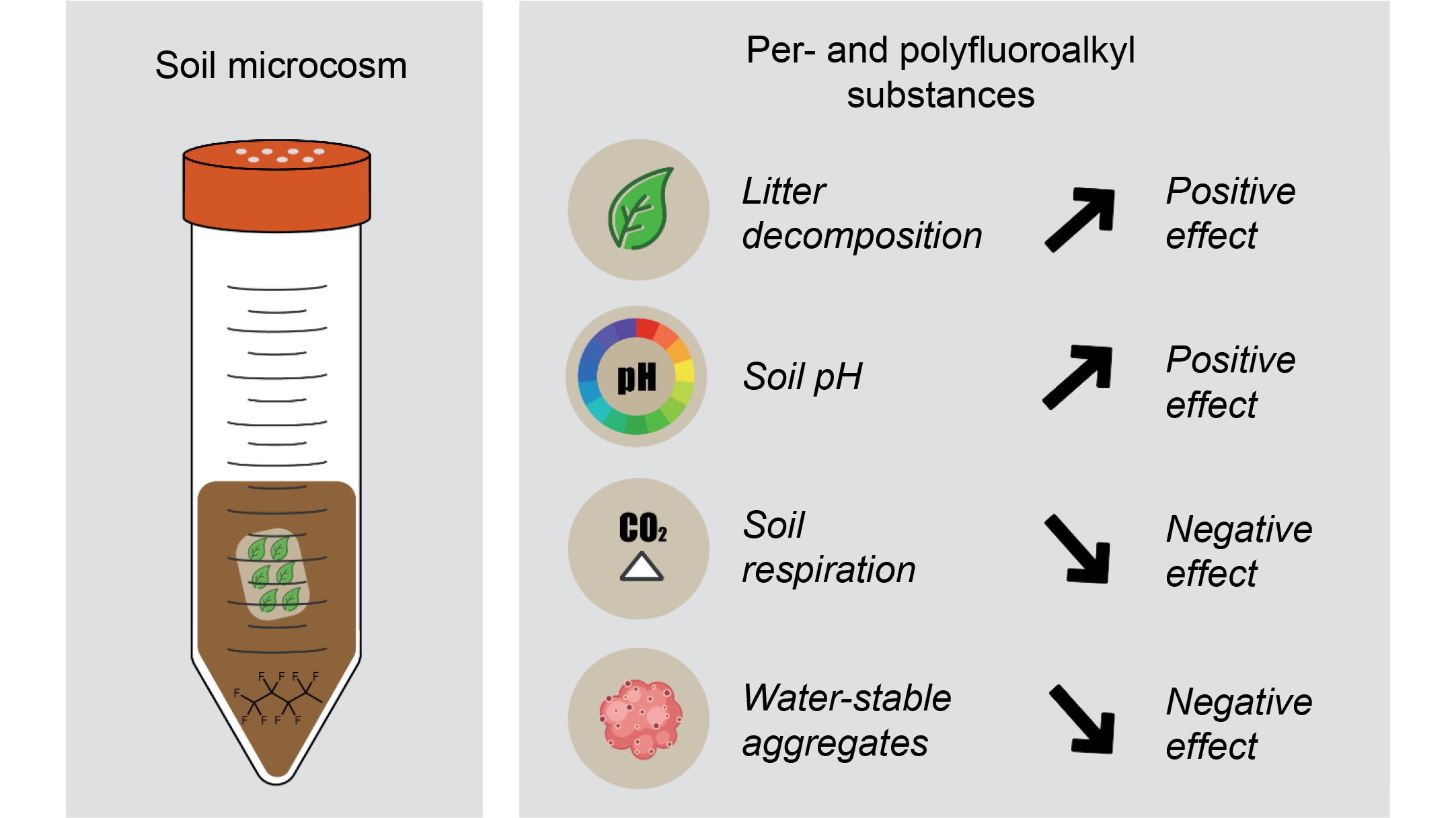 Soils are impacted globally by several anthropogenic factors, including chemical pollutants. Among those, perfluoroalkyl and polyfluoroalkyl substances (PFAS) are of concern due to their high environmental persistence, and as they might affect soil structure and function. However, data on impacts of PFAS on soil structure and microbially-driven processes are currently lacking. This study explored the effects of perfluorooctanesulfonic acid (PFOS), perfluorooctanoic acid (PFOA) and perfluorobutanesulfonic acid (PFBS) at environmental-relevant concentrations on soil health, using a 6-week microcosm experiment. PFAS (even at 0.5 ng g–1 for PFBS) significantly increased litter decomposition, associated with positive effects on β-glucosidase activities. This effect increased with PFAS concentrations. Soil pH was significantly increased, likely as a direct consequence of increased litter decomposition affected by PFAS. Soil respiration was significantly inhibited by PFAS in week 3, while this effect was more variable in week 6. Water-stable aggregates were negatively affected by PFOS, possibly related to microbial shifts. PFAS affected soil bacterial and fungal abundance, but not microbial and certain enzyme activities. Our work highlights the potential effects of PFAS on soil health, and we argue that this substance class could be a factor of environmental change of potentially broad relevance in terrestrial ecosystem functioning.