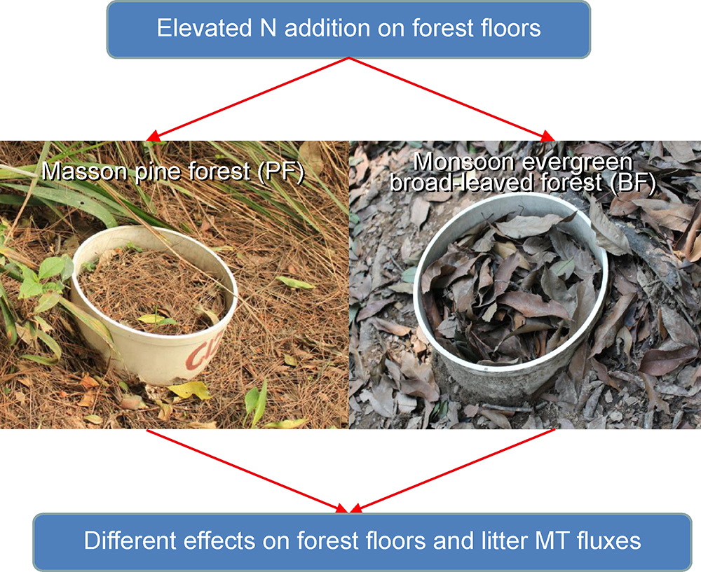 Monoterpenes (MTs) play crucial roles not only in atmospheric chemistry and global climate change but also in soil processes and soil ecology. Elevated nitrogen (N) deposition can influence soil microbial community and litter decomposition, and consequently alters MT fluxes from forest floors and litter. Yet, the responses of soil and litter MT to increased N deposition remain poorly understood and the influences of N addition are sometimes contradictory. In the present study, static chambers were placed in masson pine forest (PF) and in monsoon evergreen broad-leaf forest (BF) at Dinghushan, subtropical China. The preconcentrator-GC–MS was used to analyze the effect of N addition on MT fluxes from the forest floors and litter. The results showed that under control treatment (without N addition), the total MT emission rates were 279.90±137.17 and 102.70±45.36 pmol m−2 s−1 in the PF and BF floors, respectively, with α-pinene being the largest MT species in the PF and limonene in the BF. α-pinene and β-pinene emission rates decreased significantly in both forest floors after N addition, whereas a diverse trend was found for limonene and camphene in the PF floor. Furthermore, some MT fluxes showed significant negative correlations with soil respiration and soil temperature. Litter was important in MT fluxes from forest floors and its emission rates were enhanced by N addition. Moreover, different MT response to elevated N was found between the forest floor and litter. This study indicated that the elevated N deposition in the future would inhibit the MT emissions from the subtropical forest floor.