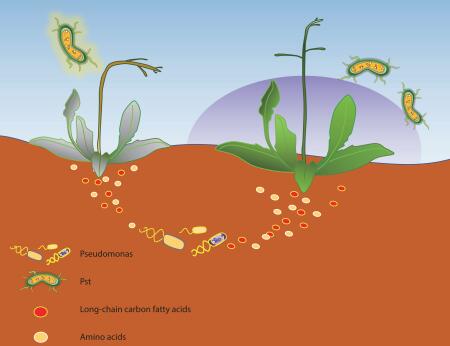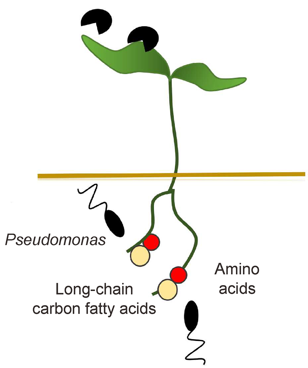 Upon foliar pathogen infection, plants release more long chain fatty acids and amino acids to their rhizosphere to recruit and stimulate specific Pseudomonas population. These Pseudomonas populations can stay in soil as legacy to induce systemic resistance of subsequent plans affording protection from foliar pathogen attack.