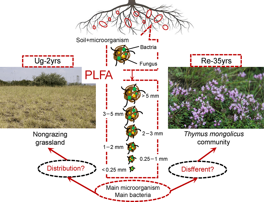 Soil aggregate fractions can regulate microbial community composition and structure after vegetation restoration. However, there has been less focus on the effects of soil aggregate fractions on the distributions of microbial communities. Here, we used phospholipid fatty acid (PLFA) analysis to explore the effects of different years of vegetation restoration (a 35-year-old Thymus mongolicus community (Re-35yrs) and a 2-year-old nongrazing grassland (Ug-2yrs)) on microbial communities within different soil aggregate sizes (<0.25 mm, 0.25–1 mm, 1–2 mm, 2–3 mm, 3–5 mm and>5 mm). The results indicated that the amount of total PLFA in Re-35yrs was 10 times greater than that in Ug-2yrs. The soil aggregate stability increased with increasing duration of vegetation restoration. In Re-35yrs, the total PLFA shown an increase as the soil aggregate size increased, and the highest values were observed in 3~5 mm. Ug-2yrs differed from Re-35yrs, the soil microbial diversity was higher in medium particle sizes (1–2 mm and 2–3 mm) and lower in microaggregates (<0.25 mm and 0.25–1 mm) and macroaggregates (3~5 mm and>5 mm). Soil microbial diversity was highest in large particle size aggregates, which resulted in low environmental stress and strong stability. The same tendency was observed in the high values of cyc/prec, S/M and soil organic matter, which indicated a lower turnover speed (F/B) of fungal energy utilization and a higher fixation rate. After years of natural restoration, the soil microbial community generally transformed from nutrient-rich to heterotroph-dominant, especially in microaggregates (reflected in the G+/G− ratio).