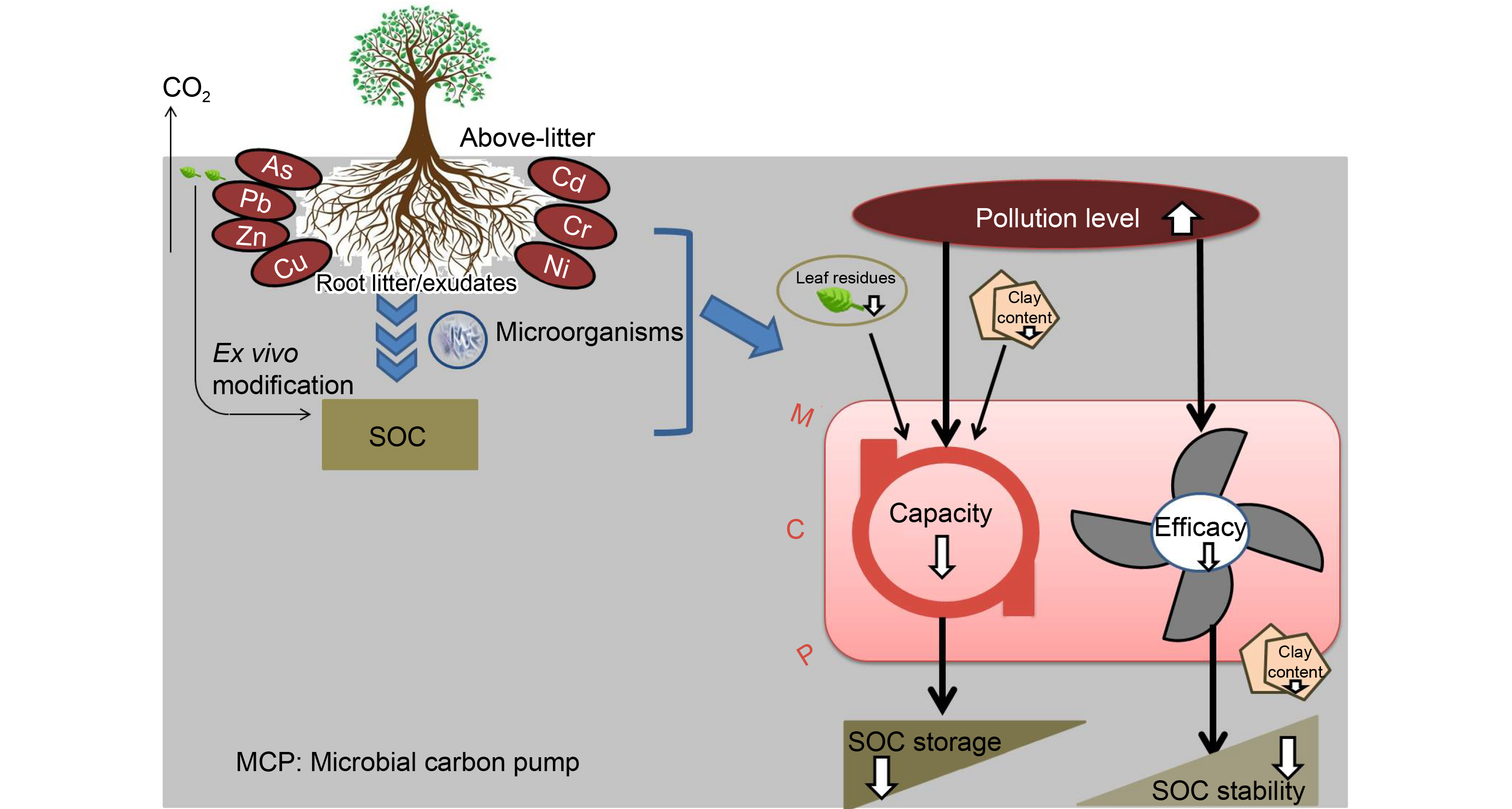 Heavy metal pollution can lead to a great loss of soil organic carbon (SOC). However, the microbial mechanisms that link heavy metal pollution to SOC remain poorly understood. Here, we investigated five apple-orchard soils at different distances from a Pb-Zn smelter. After assessing the heavy metal pollution level based on Grade II of the national soil environmental quality standard (China), we found SOC stocks and microbial carbon pump (MCP) capacity (i.e., microbial residue carbon) under medium and heavy pollution levels were significantly lower than those under safe, cordon and light pollution levels. The structural equation model showed causality in the SOC variations linked to pollution level through MCP capacity, which could contribute 77.8% of the variance in SOC storage. This verified MCP capacity can serve as a key parameter for evaluation of SOC storage under heavy metal pollution. Soil MCP efficacy, i.e., the proportion of microbial residue carbon to SOC, also decreased under medium and heavy pollution. This suggested that, with a heavier pollution level, there was a higher rate of reduction of microbial residue carbon in soil than the rate of reduction of SOC. As MCP efficacy can be a useful assessment of SOC stability, the significantly positive relationship between MCP efficacy and clay content in correlation analysis implied that lower MCP efficacy was correlated with SOC stability under the heavier pollution level. Our study provides valuable insights to identify the mechanisms of microbially mediated C transformation processes that are influenced by heavy metal pollution in agroecosystems.