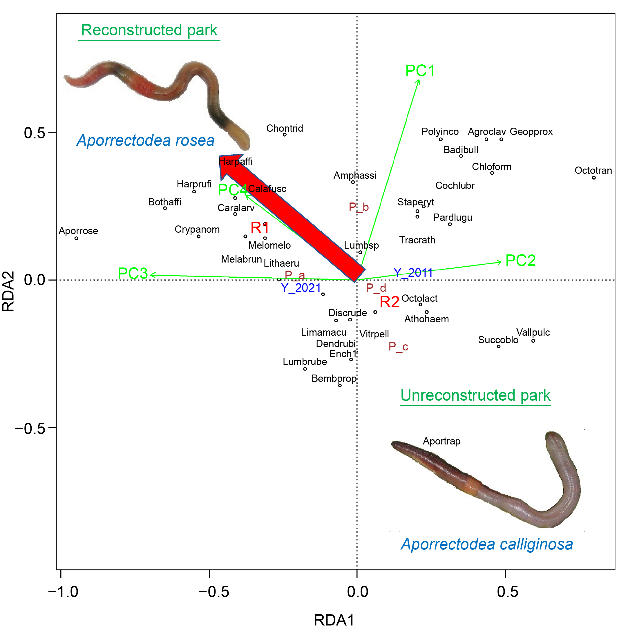 This study is based on a park in an industrial city in Ukraine. In 2019, a 2.8 ha area of the park was reconstructed. The park’s reconstruction aimed to create a comfortable environment for visitors and to improve the efficiency of ecosystem services, and thereby enhance the quality of life of citizens. The reconstruction of the park was found to cause changes in the physical properties of soils and the structure of the soil macrofauna community. The increases of soil compaction in the layers at depth 5–20 cm and the soil electrical conductivity were a consequence of technological operations during reconstruction. The park reconstruction activities can also explain 29% of the variation in the soil macrofauna community. Extracting the variation induced by the park reconstruction from the community variation induced by other causes was a major challenge. The specific changes in the community of soil macrofauna following the reconstruction of the park were revealed. The abundance of soil animal species A. rosea, A. trapezoides, H. affinis, H. rufipes, B. affinis was found to increase after the reconstruction. The earthworm A. trapezoides decreased in abundance due to the park reconstruction.