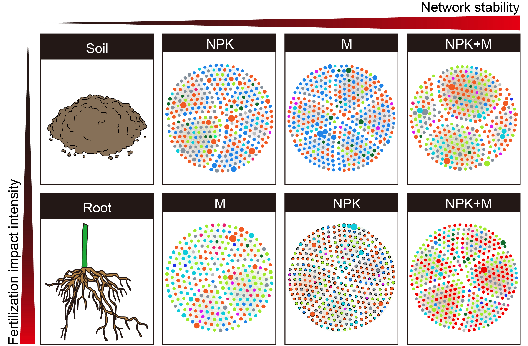 Plant health and performance are highly dependent on the root microbiome. The impact of agricultural management on the soil microbiome has been studied extensively. However, a comprehensive understanding of how soil types and fertilization regimes affect both soil and root microbiome is still lacking, such as how fertilization regimes affect the root microbiomeʼs stability, and whether it follows the same patterns as the soil microbiome. In this study, we carried out a long-term experiment to see how different soil types, plant varieties, and fertilizer regimens affected the soil and root bacterial communities. Our results revealed higher stability of microbial networks under combined organic-inorganic fertilization than those relied solely on inorganic or organic fertilization. The root microbiome variation was predominantly caused by total nitrogen, while the soil microbiome variation was primarily caused by pH and soil organic matter. Bacteroidetes and Firmicutes were major drivers when the soil was amended with organic fertilizer, but Actinobacteria was found to be enriched in the soil when the soil was treated with inorganic fertilizer. Our findings demonstrate how the soil and root microbiome respond to diverse fertilizing regimes, and hence contribute to a better understanding of smart fertilizer as a strategy for sustainable agriculture.