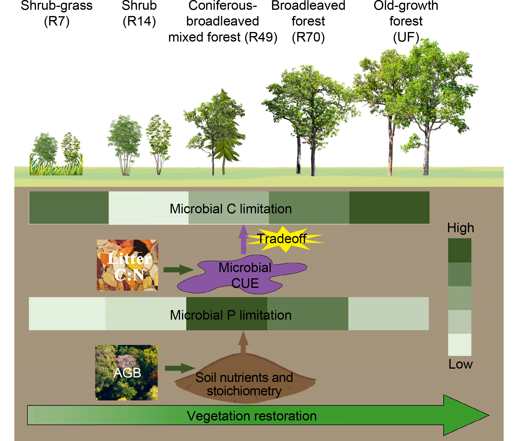 Changes in litter quality (carbon:nitrogen, C:N) and above-ground biomass (AGB) following vegetation restoration significantly impact soil physicochemical properties, yet their effects on soil microbial metabolic limitations remain unclear. We measured litter quality, AGB, soil physicochemical properties, and extracellular enzyme activity (EEA) along a vegetation restoration gradient (7, 14, 49, 70 years, and nearly climax evergreen broadleaved forests) in southern China. We also evaluated soil microbial metabolic limitations by a vector analysis of the EEA. Results revealed the soil microbial metabolisms were co-limited by C and phosphorus (P). The microbial C limitation initially decreased (before 14 years) and then increased, while the microbial P limitation initially increased (before 49 years) and then decreased. Partial least squares path modeling (PLS-PM) showed that the microbial C limitation was mainly attributed to microbial C use efficiency induced by litter quality, suggesting that microorganisms may transfer cellular energy between microbial growth and C-acquiring enzyme production. The microbial P limitation was primarily correlated with AGB-driven change in soil elements and their stoichiometry, highlighting the importance of nutrient stoichiometry and balance in microbial metabolism. The shifts between microbial C and P limitations and the strong connections of plant–soil-microbe processes during vegetation restoration revealed here will provide us with helpful information for optimal management to achieve forest restoration success.