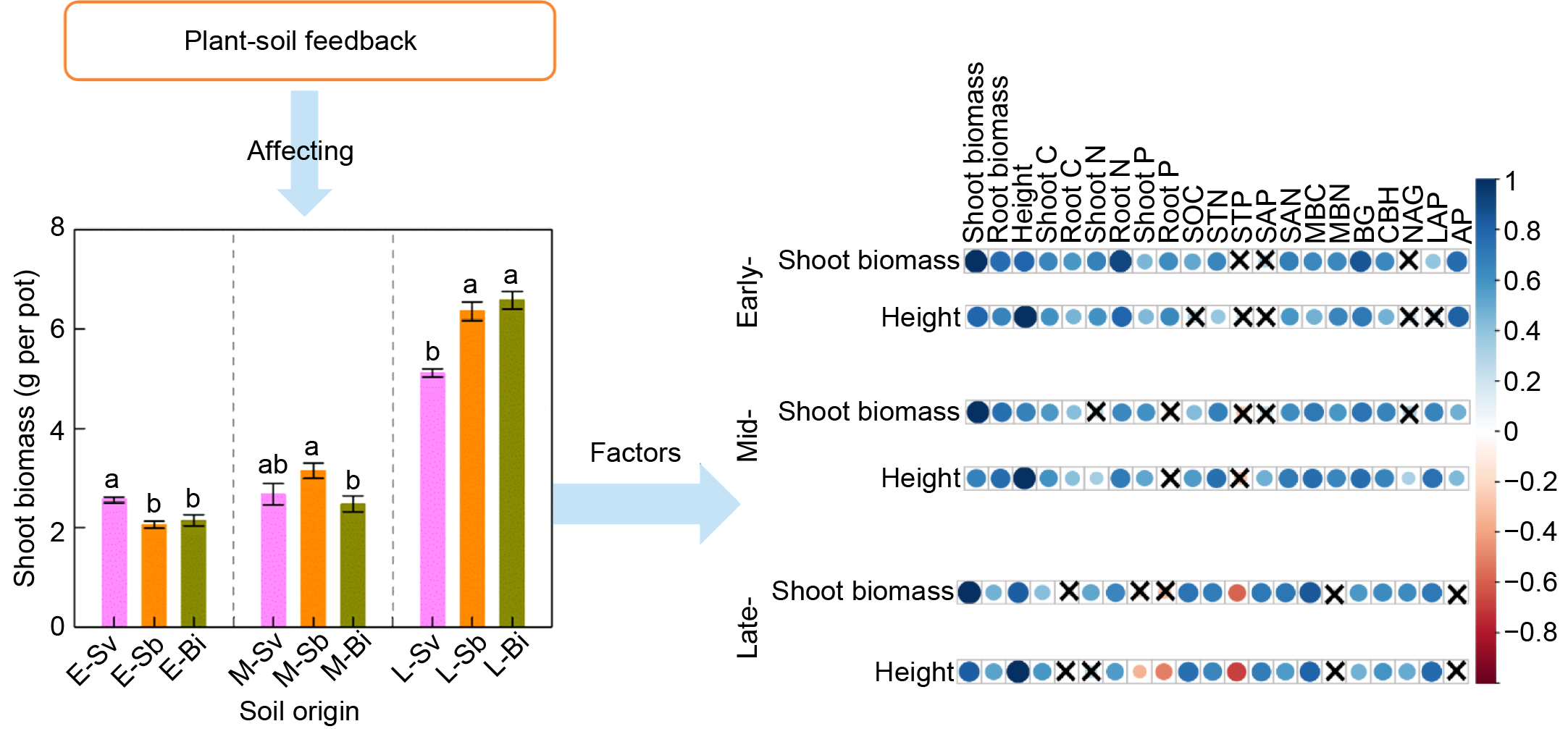 ● The PSF of three species is positive in response to different soil origin. ● The PSF of early-species is negative in response to plant growth period. ● The PSF of mid- and late-species is negative in early- species soil over time. ● The PSF of mid- and late-species is neutral in mid- species soil over time. ● The PSF of mid- and late-species is positive in late-species soil over time.