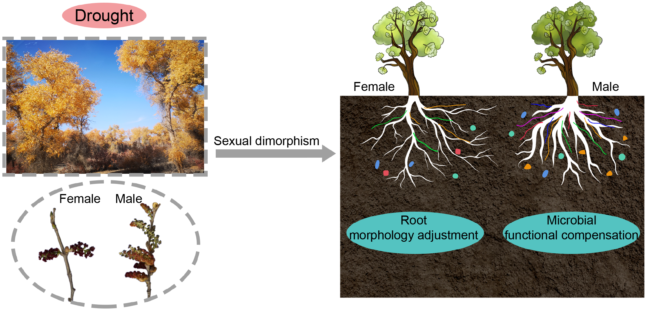 ● Sexually dimorphic belowground responses to cope with drought. ● Females show more morphological plasticity in response to water deficiency. ● Males influence rhizosphere micro-organisms to compensate for resource acquisition. ● Microbial responses are associated with root trait adjustments to drought.