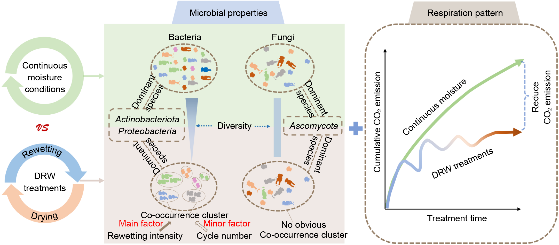 ● The bacterial and fungal diversity decreased greater in 5%−36% DRW than 5%−25% DRW. ● Fungal network was complicated after 1-cycle DRW, but that for bacteria occurred until 4-cycle DRW. ● Stronger DRW treatment enhanced the pulse amplitude of respiration in soil.