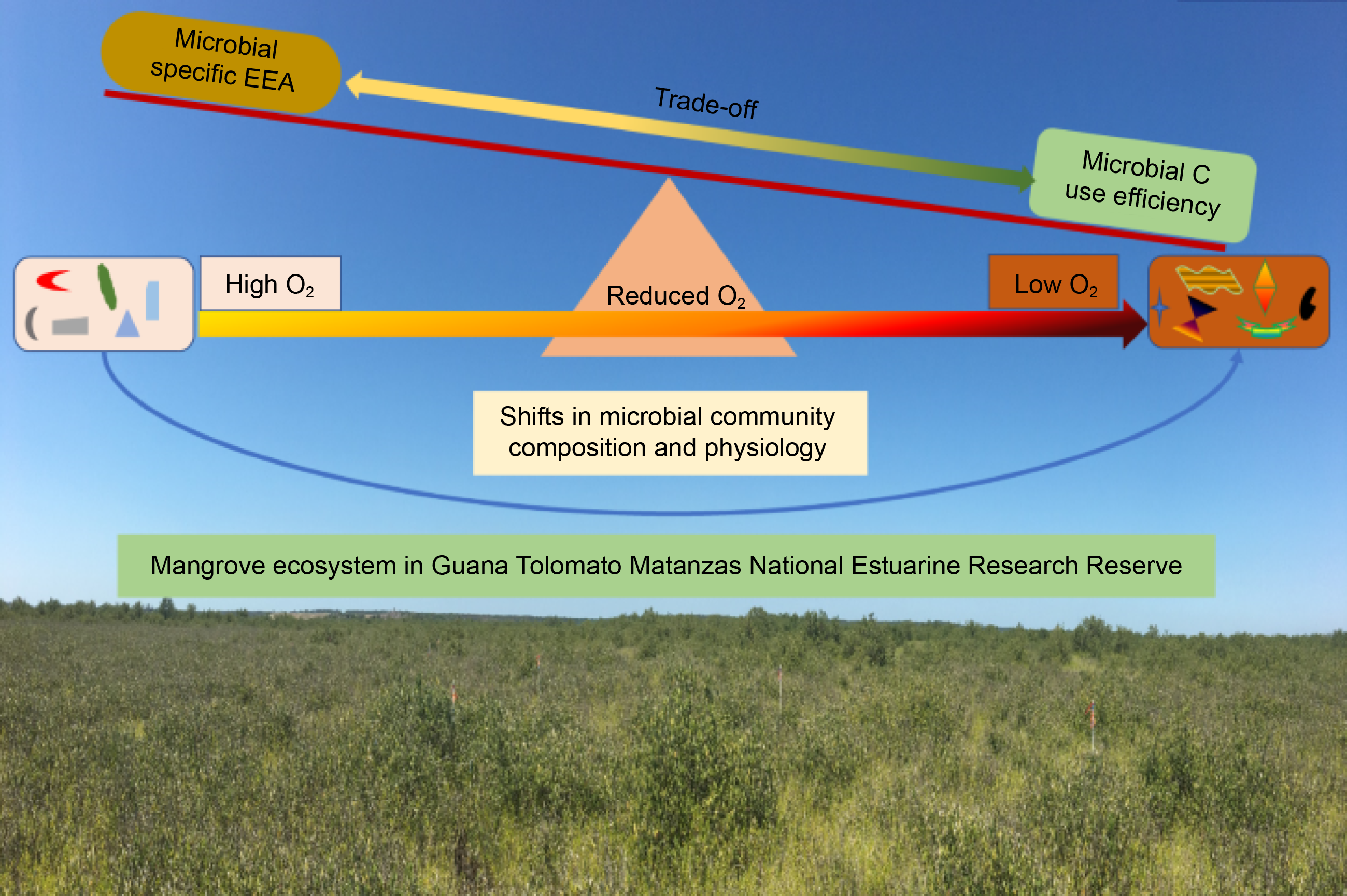 Mangroves are one of the most ecologically sensitive ecosystems to global climate change, which have cascading impacts on soil carbon (C), nitrogen (N) and phosphorus (P) cycling. Moreover, mangroves are experiencing increasing N and P loadings and reduced oxygen availability due to intensified climate change and human activities. However, both direct and interactive effects of these perturbations on microbially mediated soil C, N and P cycling are poorly understood. Here, we simultaneously investigated the effects of N and P loadings and reduced oxygen on microbial biomass, microbial respiration, and extracellular enzyme activities (EEAs) in mangrove soils. We calculated the microbial metabolic quotient (qCO2), which is regarded as a useful inverse metric of microbial C use efficiency (CUE). Our results show that reduced oxygen significantly increases both qCO2 and microbial specific EEAs (enzyme activity per unit of microbial biomass) for C-, N- and P-acquisition regardless of N or P loadings. Furthermore, we found that qCO2 positively correlated with microbial specific EEAs under reduced oxygen, whereas no clear relationship was detected under ambient oxygen. These results suggest that reduced oxygen increases microbial specific EEAs at the expense of increasing microbial respiration per unit biomass, indicating higher energy cost per unit enzyme production.