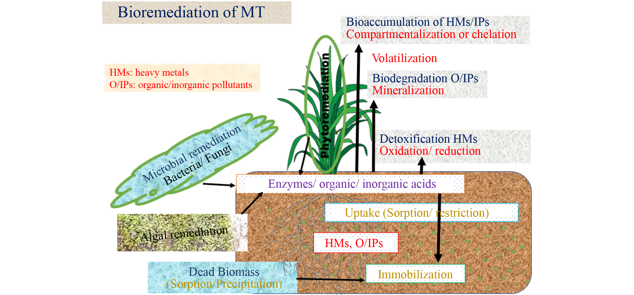 ● Mine tailings (MTs) are complex waste materials produced by mining activities and containing toxic organics and inorganics, including heavy metals present in the mining area, with high potential for environmental degradation. ● Bioremediation is an efficient and cost-effective technique for management of MTs, considering the complexity and wide coverage area by the later. ● Fortified with functional accessories provided by various cellular and molecular aspects of the cells of microorganisms and plants, pollutants in MTs are treated by mechanisms of biosorption, biodegradation, bioaccumulation, bioleaching and biosorption.
