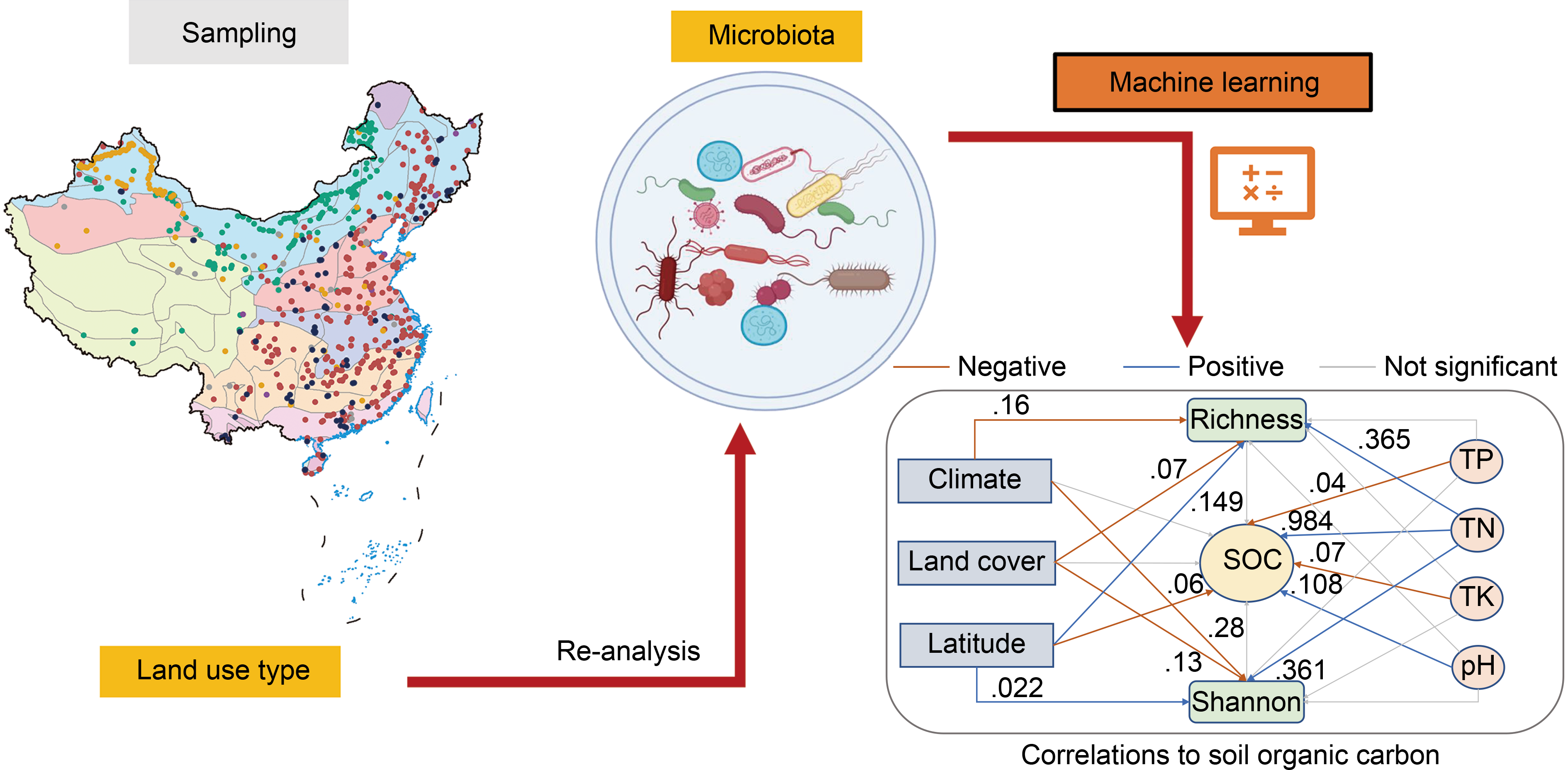 Soil organic carbon (SOC) is the largest pool of carbon in terrestrial ecosystems and plays a crucial role in regulating atmospheric CO2 concentrations. Identifying the essential relationship between soil bacterial communities and SOC concentration is complicated because of many factors, one of which is geography. We systematically re-analyzed 6102 high-quality bacterial samples in China to delineate the bacterial biogeographic distribution of bacterial communities and identify key species associated with SOC concentration at the continental scale. The type of land use was the principal driver of bacterial richness and diversity, and we used machine learning to calculate its influence on microbial composition and their co-occurrence relationship with SOC concentration. Cultivated land was much more complex than forest, grassland, wetland and wasteland, with high SOC concentrations tending to enrich bacteria such as Rubrobacter, Terrimonas and Sphingomona. SOC concentration was positively correlated with the amounts of soil total nitrogen and key bacteria Xanthobacteraceae, Streptomyces and Acidobacteria but was negatively correlated with soil pH, total phosphorus and Micrococcaceae. Our study combined the SOC pool with bacteria and indicated that specific bacteria may be key factors affecting SOC concentration, forcing us to think about microbial communities associated with climate change in a new way.