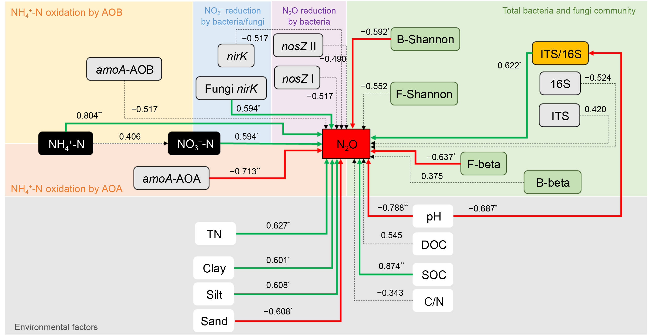 ● Soil pH was a key driver of N2O emission and sources in acidic soils. ● N2O emission was significantly positively associated with the ratio of ITS to 16S. ● N2O was significantly correlated with bacterial and fungal community composition. ● Fungi contributed to N2O in highly acidic tea plantations and vegetable fields.