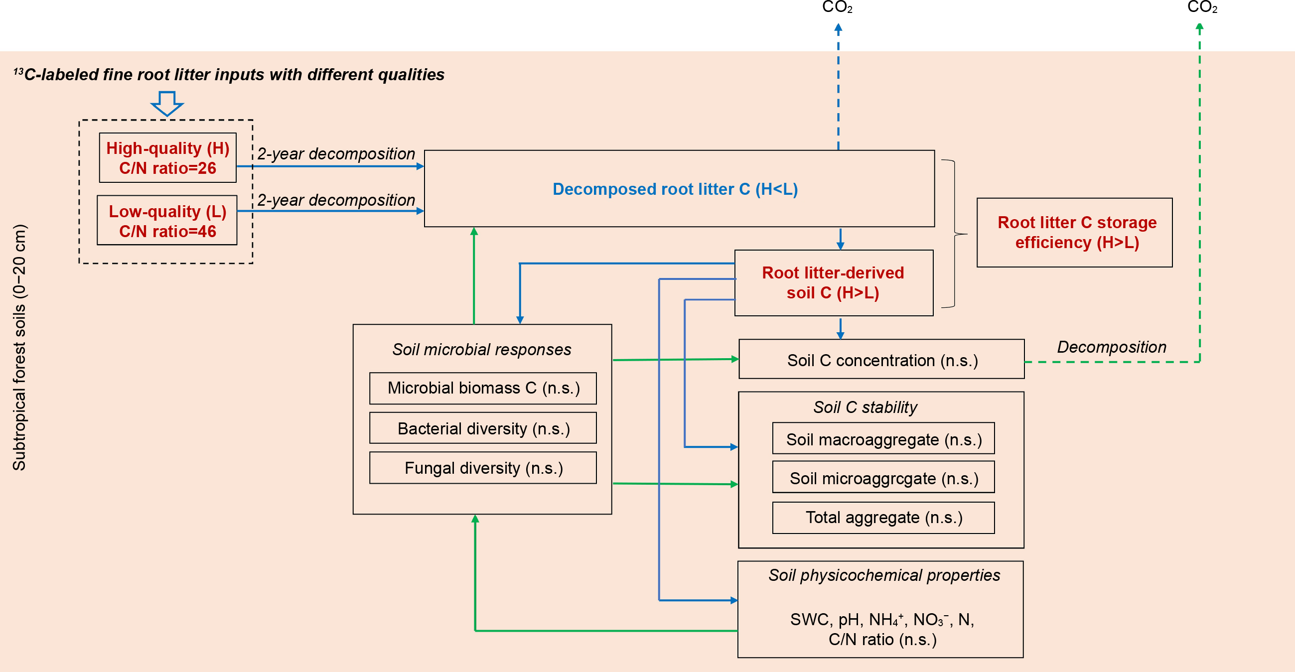 Decomposing root litter is a major contributor to soil carbon (C) storage in forest soils. During decomposition, the quality of root litter could play a critical role in soil C storage. However, it is unclear whether root litter quality influences soil C storage efficiency. We conducted a two-year greenhouse decomposition experiment using 13C-labeled fine root litter of two tree species to investigate how root litter quality, represented by C to nitrogen (C/N) ratios, regulates decomposition and C storage efficiency in subtropical forest soils in China. ‘High-quality’ root litter (C/N ratio = 26) decayed faster during the first year (0−410 days), whereas ‘low-quality’ root litter (C/N ratio = 46) decomposed faster toward the end of the two-year period (598−767 days). However, over the two years of the study, mass loss from high-quality root litter (29.14 ± 1.42%) was lower than ‘low-quality’ root litter (33.01 ± 0.54%). Nonetheless, root litter C storage efficiency (i.e., the ratio of new root litter-derived soil C to total mineralized root litter C) was significantly greater for high-quality root litter, with twice as much litter-derived C stored in soils compared to low-quality root litter at the end of the experiment. Root litter quality likely influenced soil C storage via changes in microbial diversity, as the decomposition of high-quality litter declined with increasing bacterial diversity, whereas the amount of litter-derived soil C from low-quality litter increased with fungal diversity. Our results thus reveal that root litter quality mediates decomposition and C storage in subtropical forest soils in China and future work should consider the links between root litter quality and soil microbial diversity.