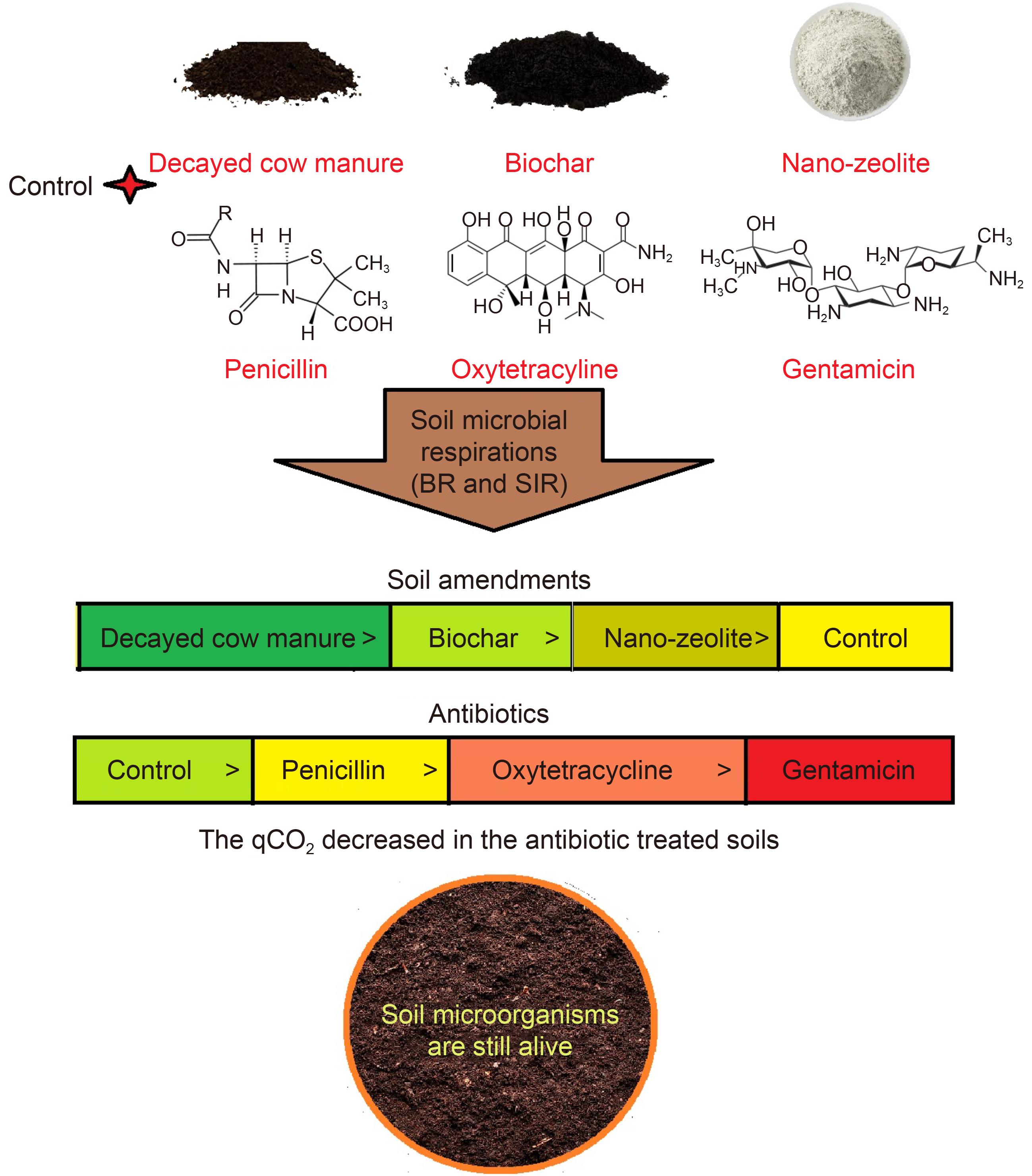This study aimed to describe the static and cidal adverse effects of antibiotics on soil microbial activity resulting from manure application. So, in the present study, the treatments included: without antibiotics; application of gentamicin, oxytetracycline, and penicillin each in different concentrations (50, 100, and 200 mg kg−1 dry soil). They were applied in soils treated with and without organic and mineral conditioners (cow manure, biochar, and nano-zeolite). Soil microbial respiration and metabolic quotient were studied at three time periods (1−7, 7−30, and 30−90 days) during a 90-day incubation of the treated soils. Antibiotics applied to the soil samples significantly decreased soil basal respiration (BR) values compared to those of the control, and the most significant decrease was observed for gentamicin. Gentamicin had a short intensive impact, alleviated by manure and biochar, on soil copiotrophs. After a significant initial reduction in substrate-induced respiration (SIR), gentamicin application then caused a substantial increase in SIR values. Unexpectedly metabolic quotient decreased in the antibiotic-treated soils. This study revealed that the static effects of the applied antibiotics in soil were greater than the cidal effects.