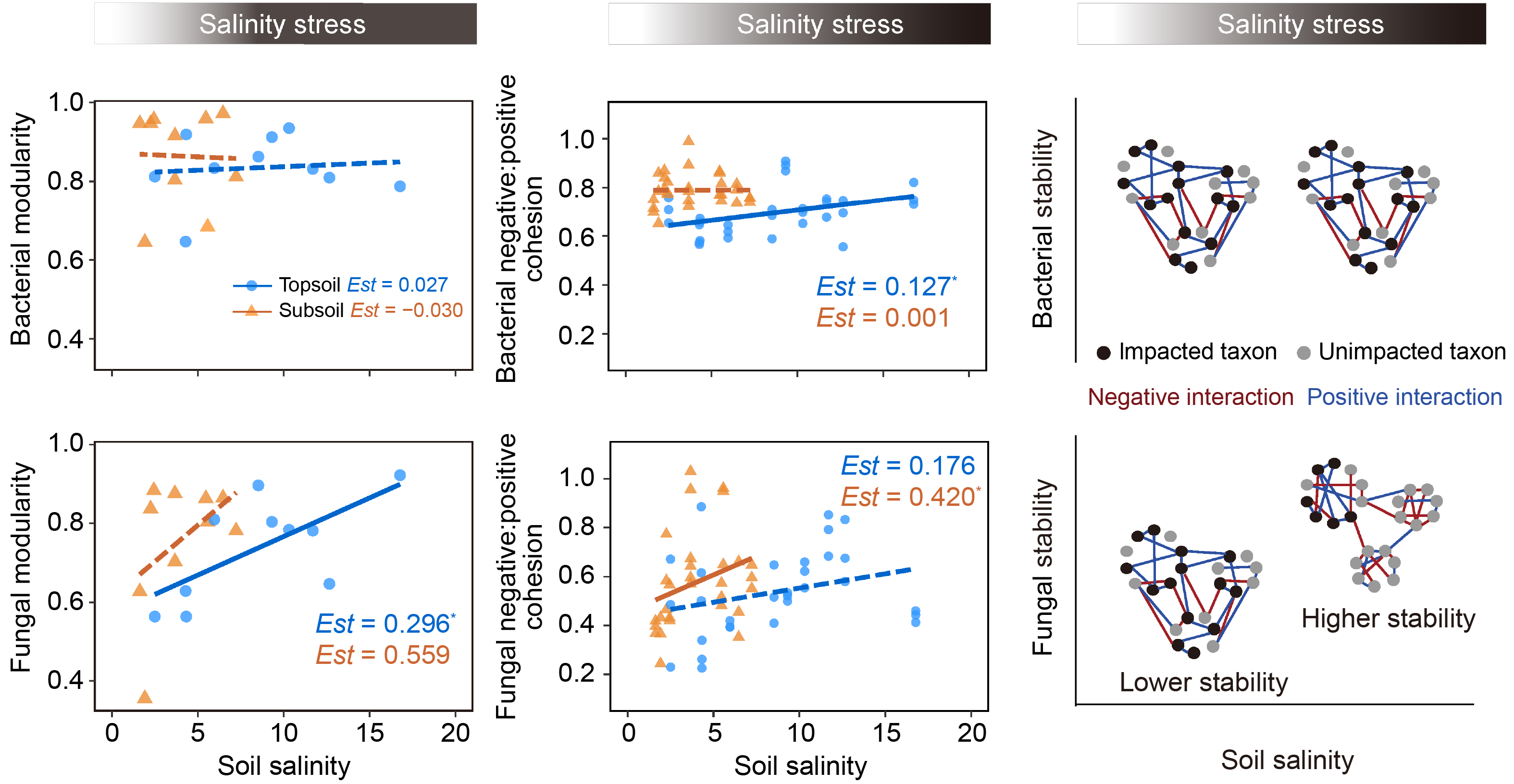 ● Bacterial richness declined but fungal richness increased under salinization. ● Bacteria did not become interactively compact or facilitative under salinization. ● Fungi exhibited more compartmentalized and competitive patterns under salinization. ● Fungal stability showed steeper increases under salinization than bacterial stability.