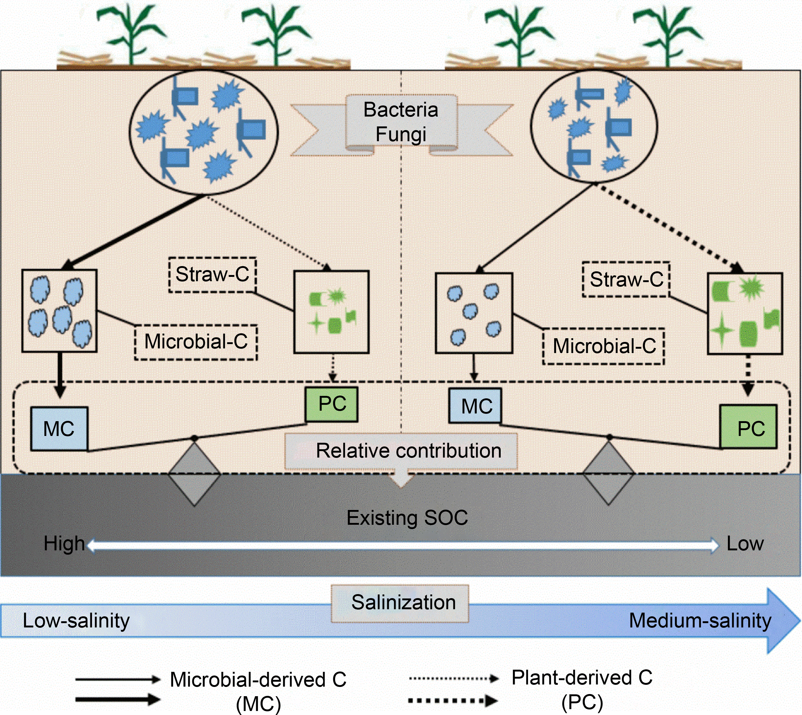 Salinization affects microbial-mediated soil organic carbon (SOC) dynamics. However, the mechanisms of SOC accumulation under agricultural management practices in salt-affected soils remain unclear. We investigated the relative contribution of microbial-derived and plant-derived C to SOC accumulation in coastal salt-affected soils under straw-returning, by determining microbial necromass biomarkers (amino sugars) and particulate organic C (POC). Results showed that, straw-returning increased necromass accumulation in low-salinity soil but did not change its contribution to SOC. In medium-salinity soil, straw-returning did not increase necromass accumulation but decreased its contribution to SOC. In low- and medium-salinity soils, the contribution of POC to SOC showed the opposite direction to that of the necromass. These results suggest that under straw-returning, the relative contribution of microbial-derived C to SOC decreased with increasing salinity, whereas the reverse was true for plant-derived C. Our results highlighted that straw-returning reduces the contribution of microbial anabolism to SOC accumulation in salt-affected soils with increasing salinity.