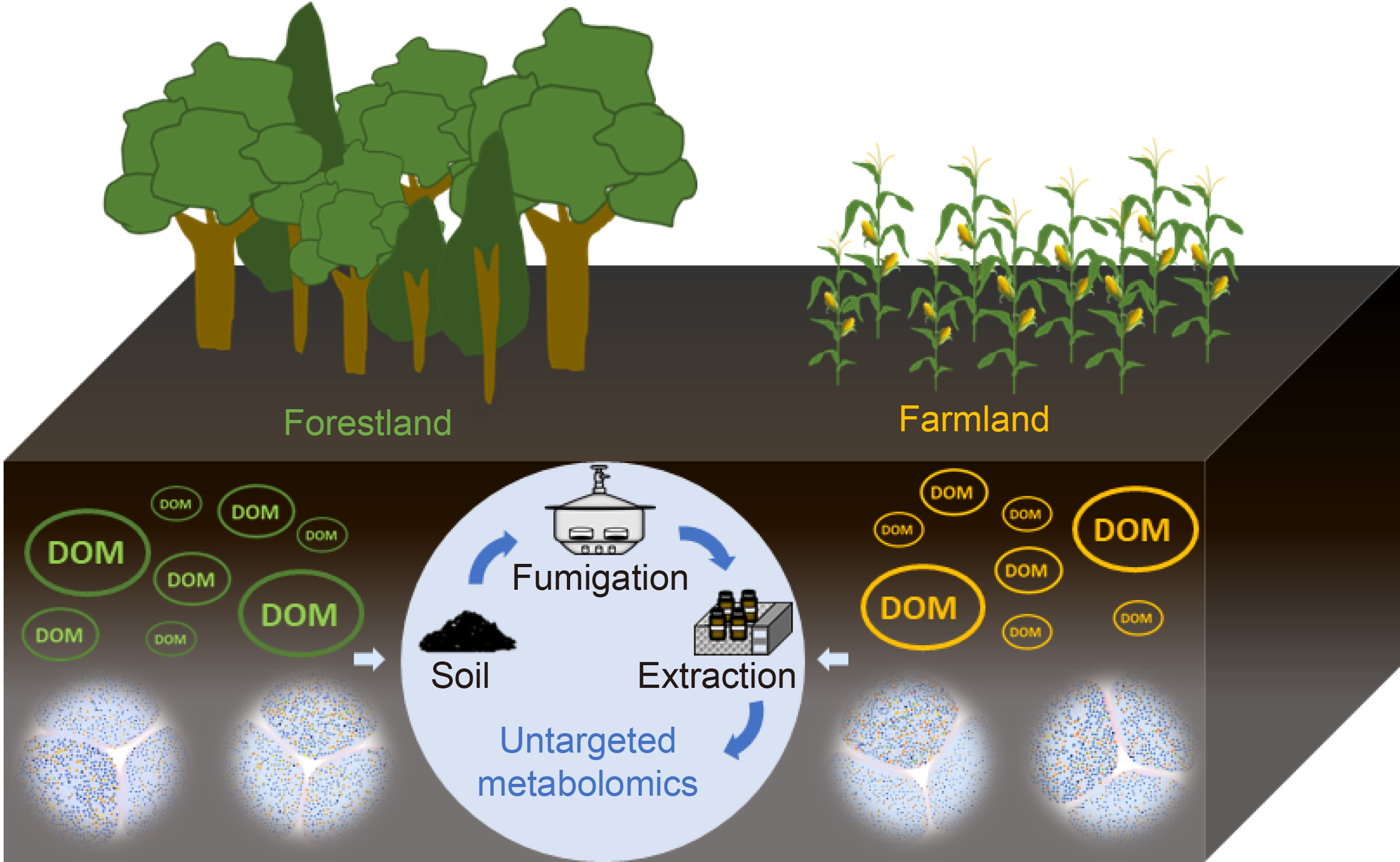 Mollisol soil is a major contributor to food production. Clarification of the molecular characteristics of dissolved organic matter (DOM) will contribute to the overall understanding and management of mollisol soil. However, the complexity of DOM poses a challenge to understanding its molecular characteristics. In this study, we investigated the molecular characteristics of DOM (< 1000 Da) in mollisol soils with different soil use patterns (forestland and dryland) based on untargeted metabolomics. Here, we confirmed the feasibility of untargeted metabolomics for the molecular characterization of DOM in mollisol soils. DOM in forestland is mainly derived from plant metabolites, and DOM can perform more biological functions. However, DOM in dryland has complex composition and has powerful co-occurrence network interactions due to human activities. Water has better extraction efficiency for polar DOM, while organic reagents can efficiently extract lipid-like DOM, but the polarity of the extractant has less influence on the DOM than the soil physicochemical properties. Meanwhile, 14-dihydroxyzeatin screened based on metabolomics can be used as a potential indicator for corn land. Therefore, untargeted metabolomics can be an effective method to characterize the DOM molecules of mollisol soil, which provides new insights for management of mollisol soil and sustainable agricultural development.