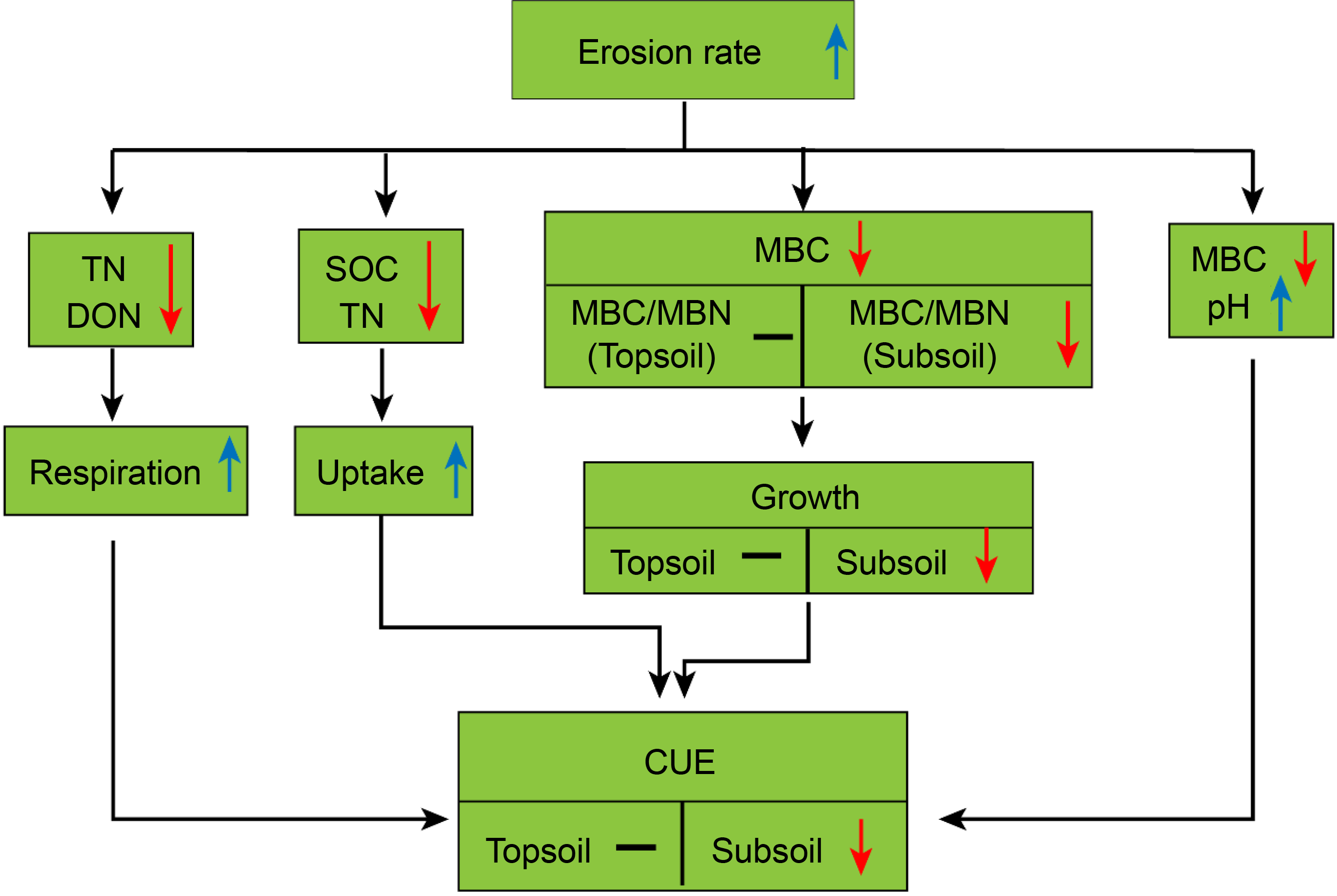 ● Soil erosion decreased soil microbial CUE and increased microbial uptake of carbon. ● Soil erosion decreased microbial CUE by decreasing substrate C, N and MBC and increasing soil pH. ● Soil microbes had to increase their uptake rate to cope with the loss of substrates with increasing erosion rate. ● Soil microbial respiration increased with increasing degree of erosion. ● Soil microbial growth rate remained relative stable under different degrees of soil erosion. ● Microbial CUE in soil surface was less responsive to erosion than that in deeper soil.
