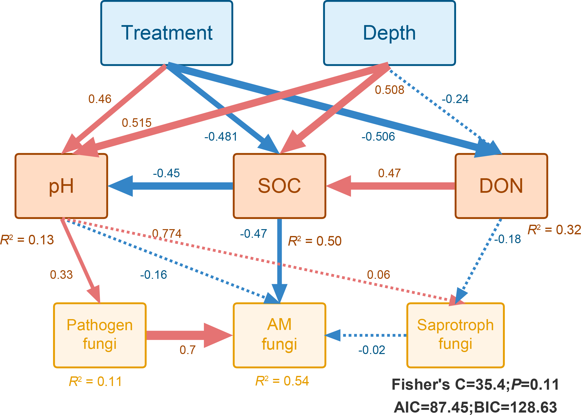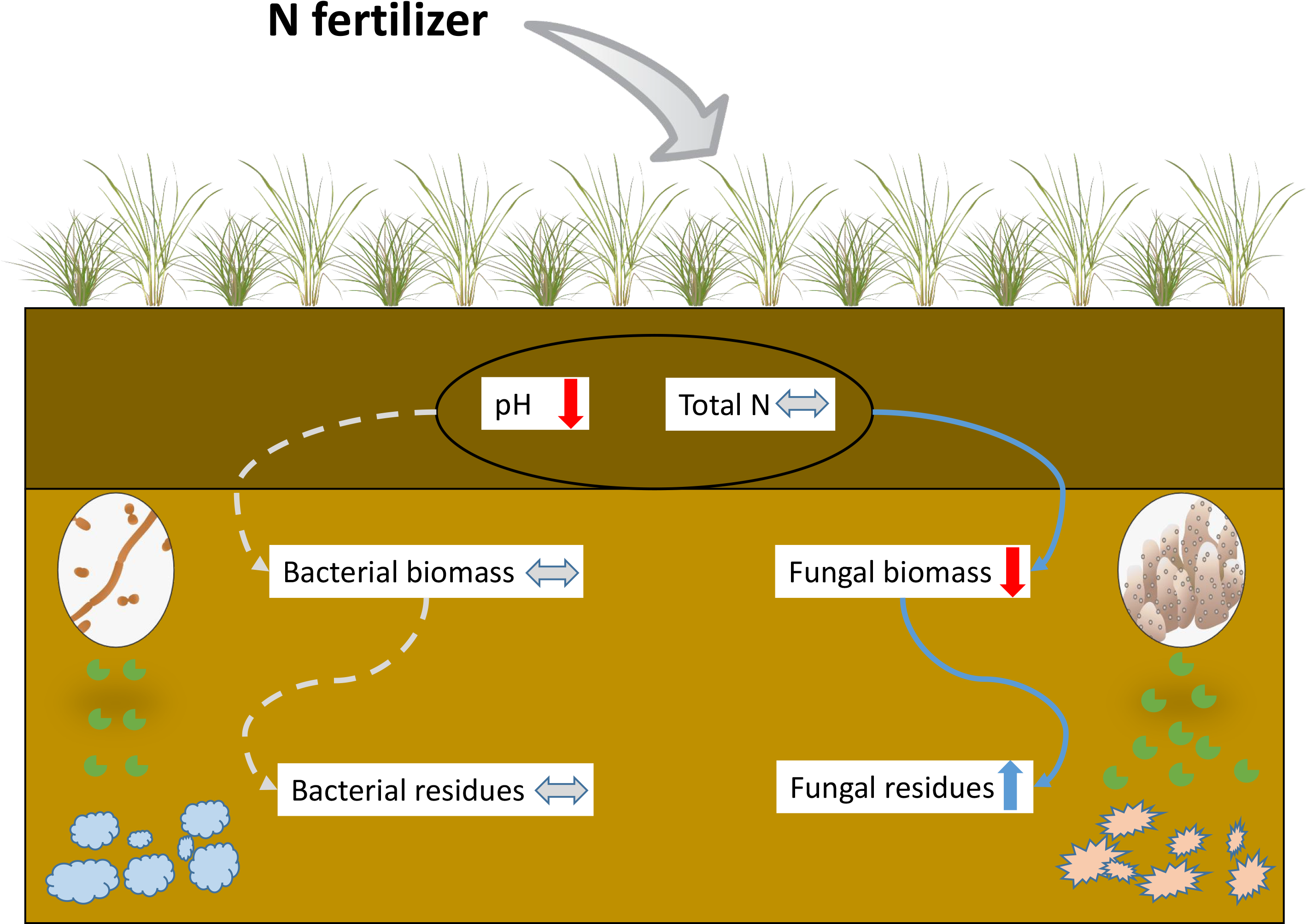 ● Fungi are more sensitive to long-term nitrogen addition than bacteria. ● Long-term nitrogen addition significantly reduces fungal biomass, but promotes the accumulation of fungal residues in soil. ● Long-term nitrogen addition has no significant impact on bacterial biomass and residues.