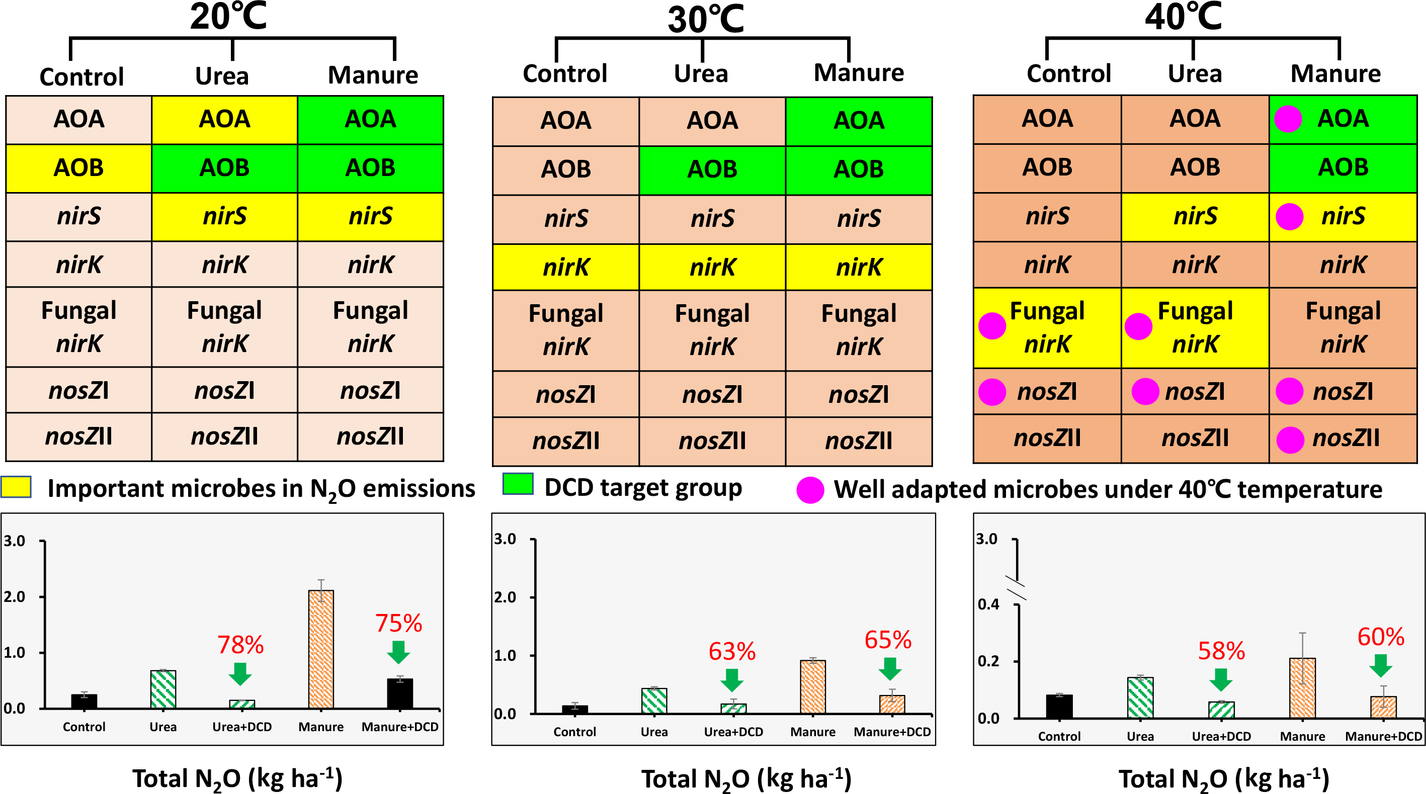 ● Dicyandiamide decreased N2O emissions even under 40°C. ● Ammonia oxidizers and nirS were well adapted to 40°C in manured soils. ● Fungal nirK tolerated high temperature better in urea than manure treatment. ● Compared to nosZ II, nosZ I adapted to all temperature regardless of fertilization. ● nirS -denitrifier dominated N2O emissions at high temperature in fertilized soil.