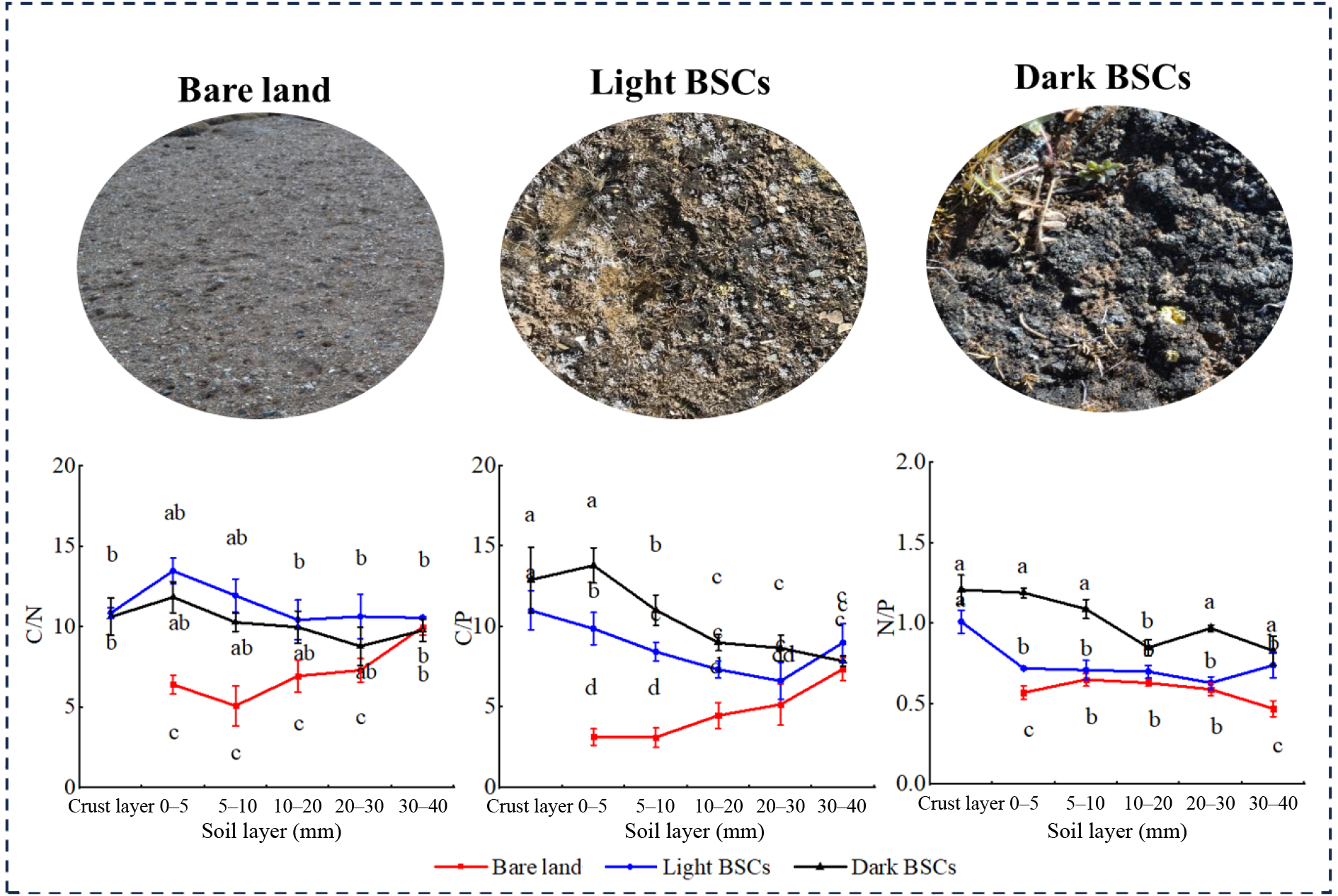 ● Biocrusts are one of the most important components of the land cover in frozen ground regions on the Qinghai–Tibet Plateau, which increased the silt particle content, enhanced field moisture capacity, and reduced soil bulk density. ● Biocrusts significantly increased levels of SOC (22.6−30.8 g kg−1) and TN (2.1−2.8 g kg−1) within the 0–40 cm soil layer, while they had no significant influence on the TP contents. ● Biocrusts also had influence on the stoichiometry characteristics, and the C/N, C/P and N/P ratios of the biocrusts were all higher than that of the bare land, which revealed that biocrusts enhanced the contents of SOC and TN in presuccessional period of biocrusts and reduced the availability of P in their postsuccessional period.