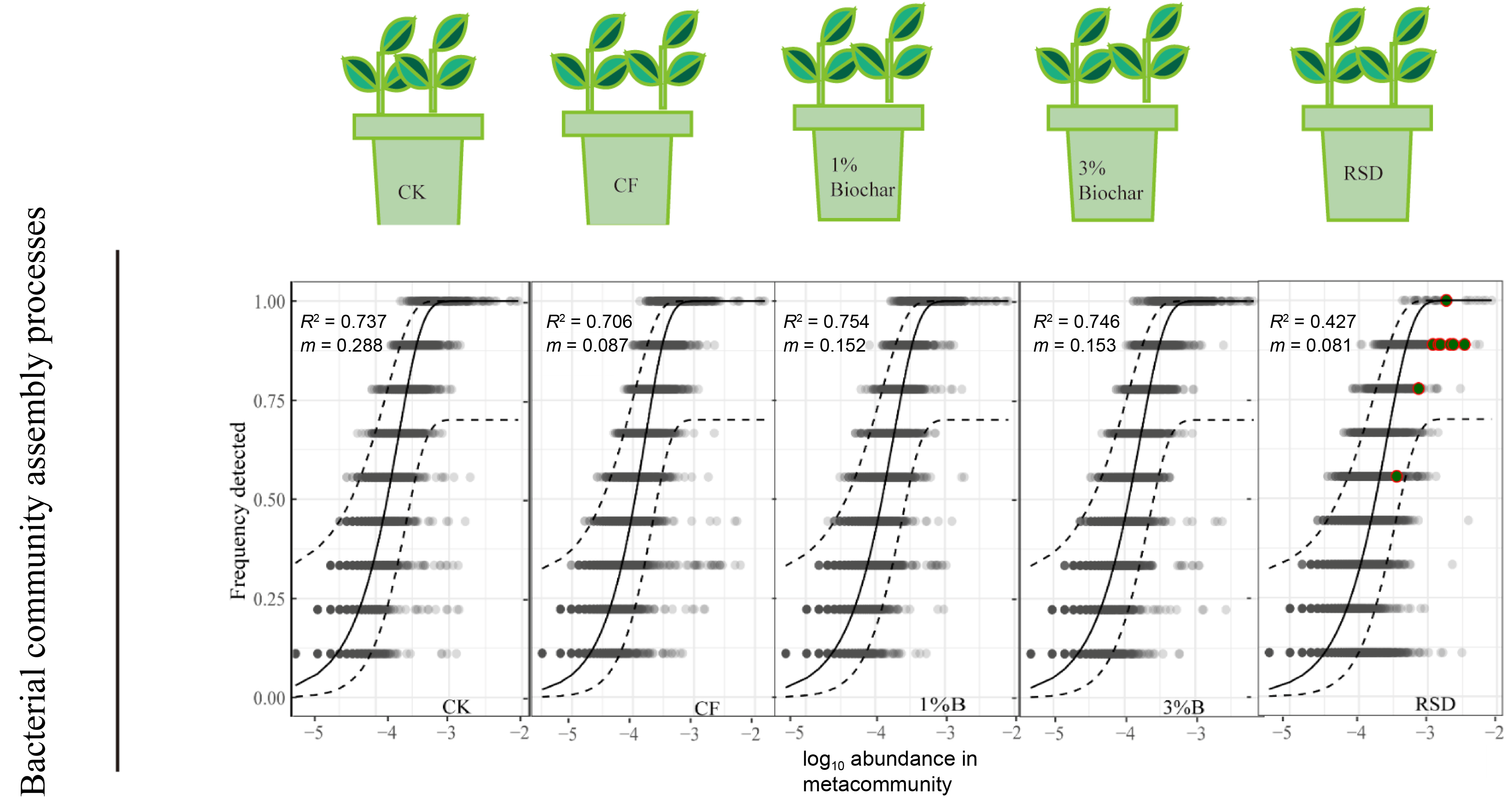 Reductive soil disinfestation (RSD) is an important tool for sustainable agricultural productivity. However, the differences in soil bacterial communities and their community assembly processes among RSD and other treatment strategies (e.g., biochar and chemical fumigation) are still subject to open questions. In this study, soils subjected to various treatments–un-treated control (CK), chemical soil fumigation with CaCN2 (CF), 1% biochar (1%B), 3% biochar (3%B), and reductive soil disinfestation (RSD) are investigated. Soil samples were collected, incubated, and then used for growth of tomato plants. The Sloan neutral community model indicates that stochastic processes dominate in bacterial community assembly for both biochar and CF amendments. In contrast, this work shows that RSD treatment can have a strong impact on soil bacterial community composition. The relative abundance of Firmicutes increased during unplanted soil incubation, whereas Proteobacteria and Bacteroidetes dominated in the rhizosphere after planting of tomatoes. Normalized stochasticity ratio reveals that deterministic selection played an important role in the bacterial assembly under RSD amendment. We found that RSD amendment yielded lower biomass than that for other treatments after 28 days of tomato growth. Our results suggest that although RSD treatment has great potential to rebuild soil bacterial ecology by shaping bacterial communities and their assembly processes, it is important to monitor and manage soil conditions (e.g., soil nutrients or physical properties) before planting to ensure plant productivity.