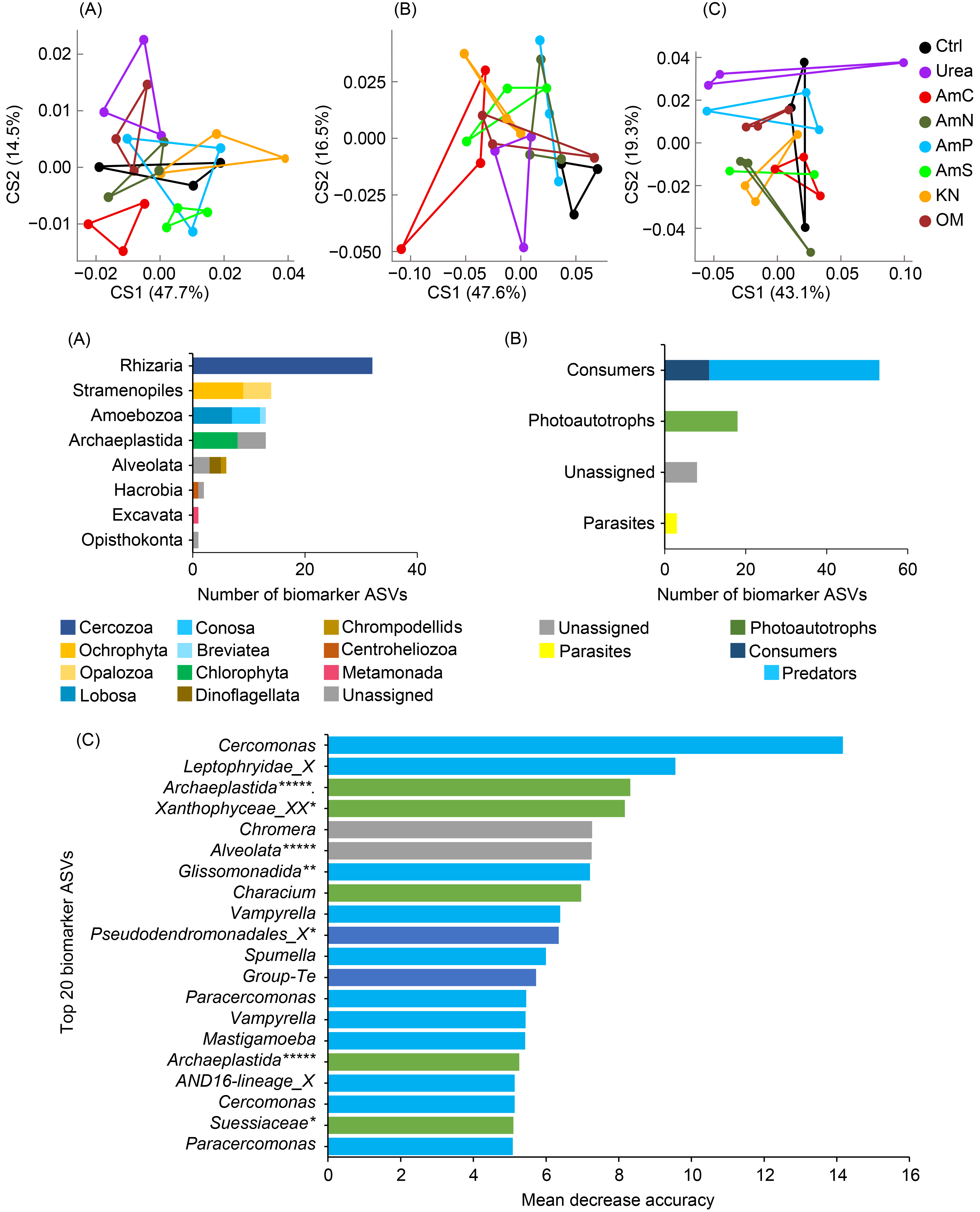 Protists are one of the most diverse and dominant microbial groups and they play critical roles in the soil ecosystem. Although nitrogen fertilizers have a profound impact on protist communities, still less is known about how different nitrogen fertilizer types affect protist community composition in different soil types. Here we investigated the effects of six inorganic nitrogen fertilizers (urea, ammonium nitrate, ammonium sulfate, potassium nitrate, ammonium chloride, and diammonium hydrogen phosphate) and an organic fertilizer (a mixture of rice husk and cow manure) on protist community composition in three paddy field soils using a high-throughput sequencing method. The effect of the fertilizers on the functional groups of protists, namely consumers (predators and decomposers), photoautotrophs, and parasites (plant pathogens and animal parasites) was also analyzed. The results showed that nitrogen fertilizers had distinctive effects on the beta diversity of the protists, while we also observed that the same fertilizer had slightly different effects depending on the soil type. Amoebozoa and Rhizaria were the most affected protist taxonomical groups, while predatory protists were the main functional groups that were affected by nitrogen fertilizers. Random forest analysis showed that most of the fertilizer-affected protists were predators, among which Cercozoa was the most affected taxa. In conclusion, our results provide important insights into the impact of nitrogen fertilizers on soil protist communities.