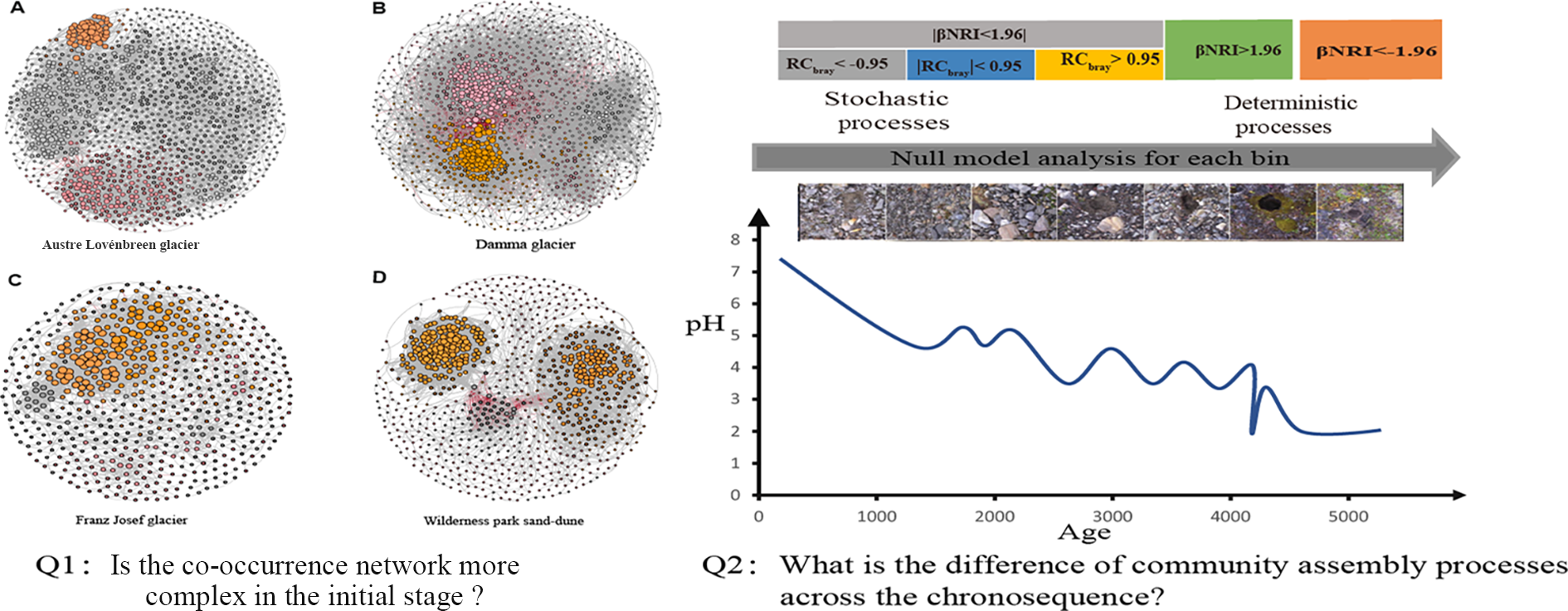 ● Bacterial networks became less connected with soil development along primary succession. ● Community composition was initially governed by stochasticity, but as succession proceeded, there was a progressive increase in deterministic selection correlated with decreasing pH. ● Most natural microorganisms in extreme habitats exist as consortia that provide robustness and extensive metabolic capabilities in structuring bacterial communities.