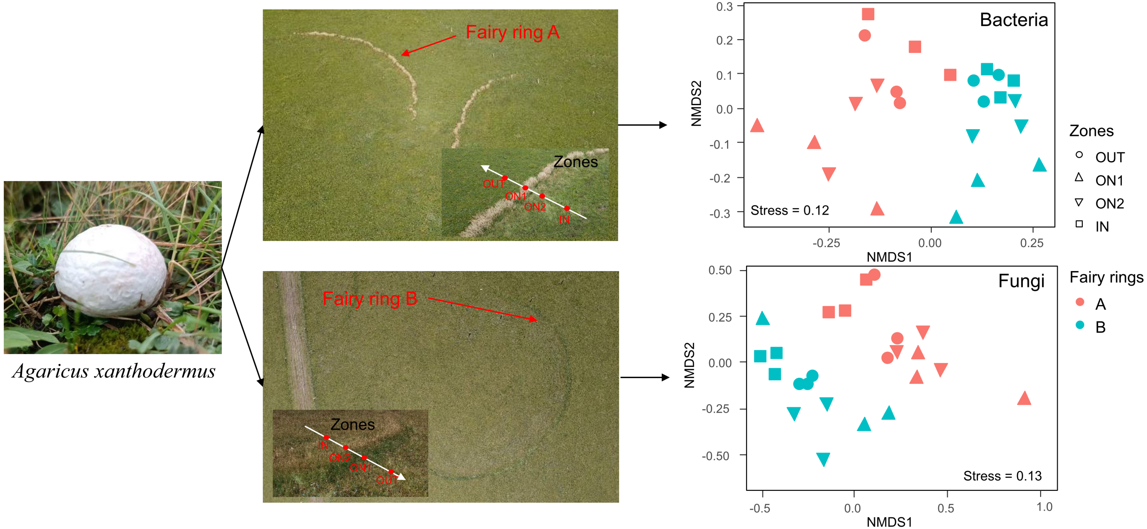 ● A new fairy ring fungus was reported in this study. ● Fairy ring fungi influence plants and soil microbes by promoting soil nutrients. ● The effect of fairy ring fungi on plants and soil microbes depends on the habitat type.