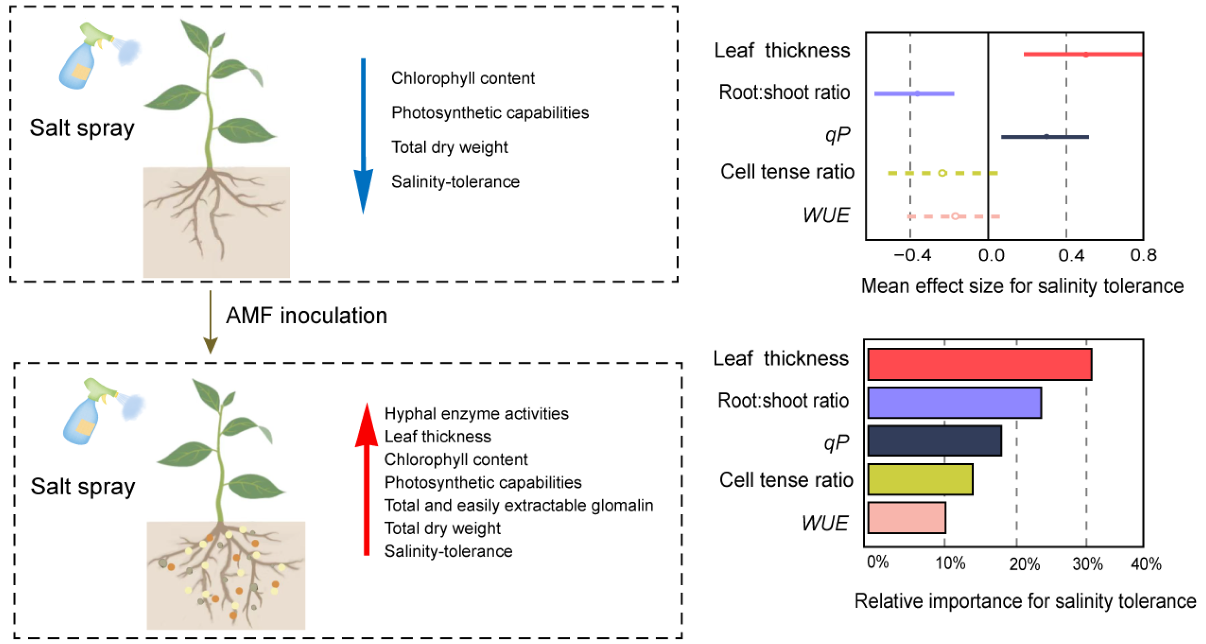 ● Salt spray is a natural disturbance in coastal area of Southern China. ● Arbuscular mycorrhizal fungi can mediate the detrimental effects of salt spray. ● Leaf thickness and photosynthetic ability are key parameters. ● Combined fungi may be beneficial for trees grown in coastal areas.