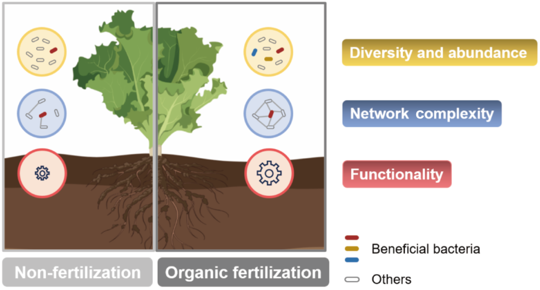● Organic fertilization increased the richness and abundance of beneficial communities. ● The increase in the beneficial communities resulted from soil property optimization. ● Organic fertilization enhanced the functionality of bacterial communities. ● Plants exhibited a preference for internalizing beneficial bacteria.