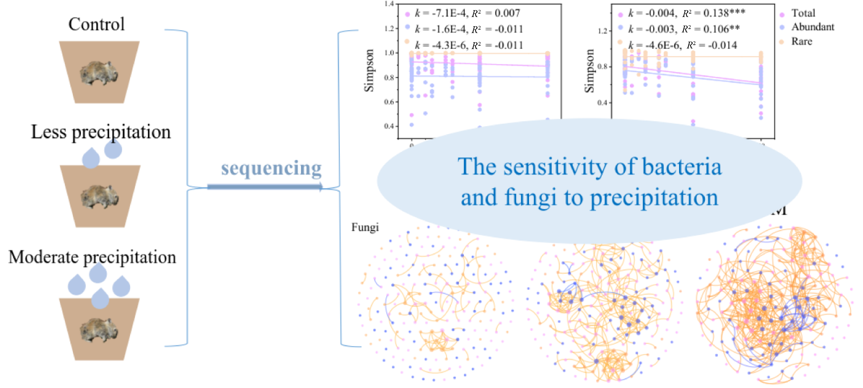 ● Fungi are more sensitive to precipitation than bacteria. ● The susceptibility of abundant and rare bacteria to precipitation has no difference. ● Abundant taxa of fungi are more vulnerable to precipitation than rare ones.