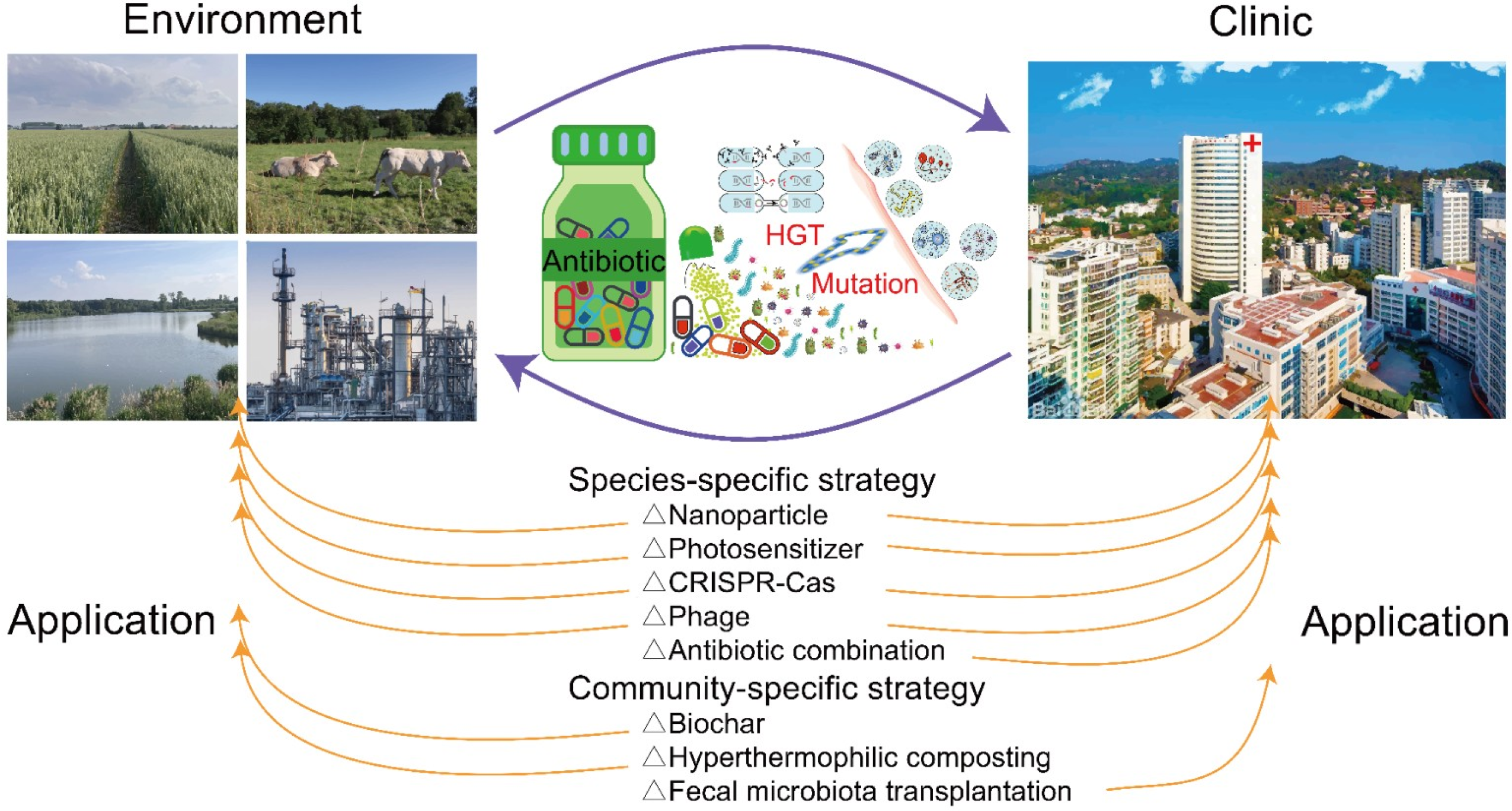 ● ARGs and ARB in typical environments which exposed to antibiotics are prevalent. ● Nanoparticle- and photosensitizer-related technology can clear specific ARGs or ARB. ● CRISPR-Cas- and phage-related technology can eliminate particular ARGs or ARB. ● Antibiotic combination can be used to eliminate microbial resistance. ● Microbiome-specific technology can eradicate most types of ARGs or ARB in one shot.