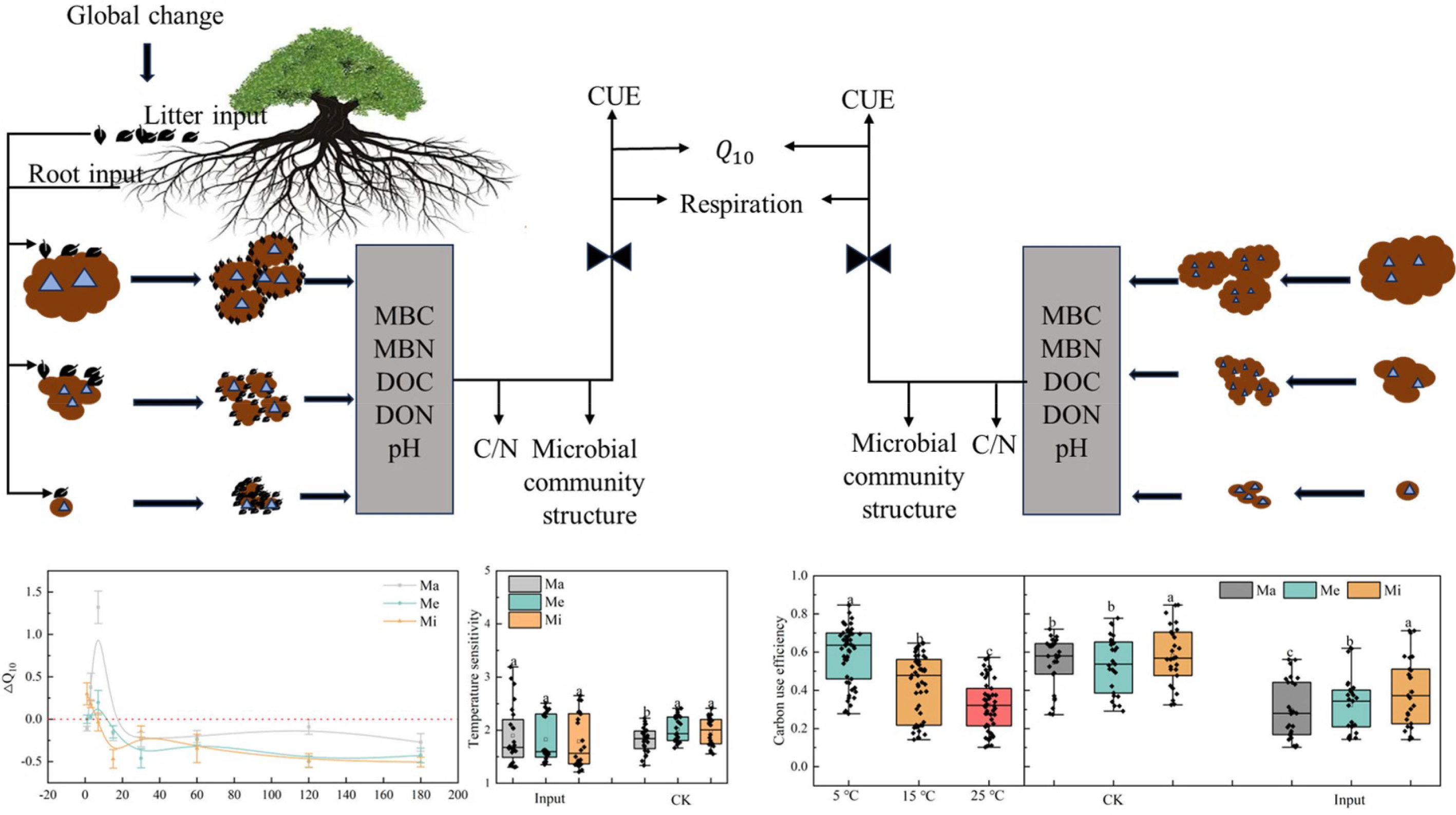 ● Soil aggregates affect soil respiration and its temperature sensitivity. ● Organic matter input boosts soil respiration, affected by temperature and aggregate size. ● Q 10 declines with increasing aggregate size, influenced by soil quality index. ● Microbial CUE drops with organic matter input, temperature and aggregate size increase.