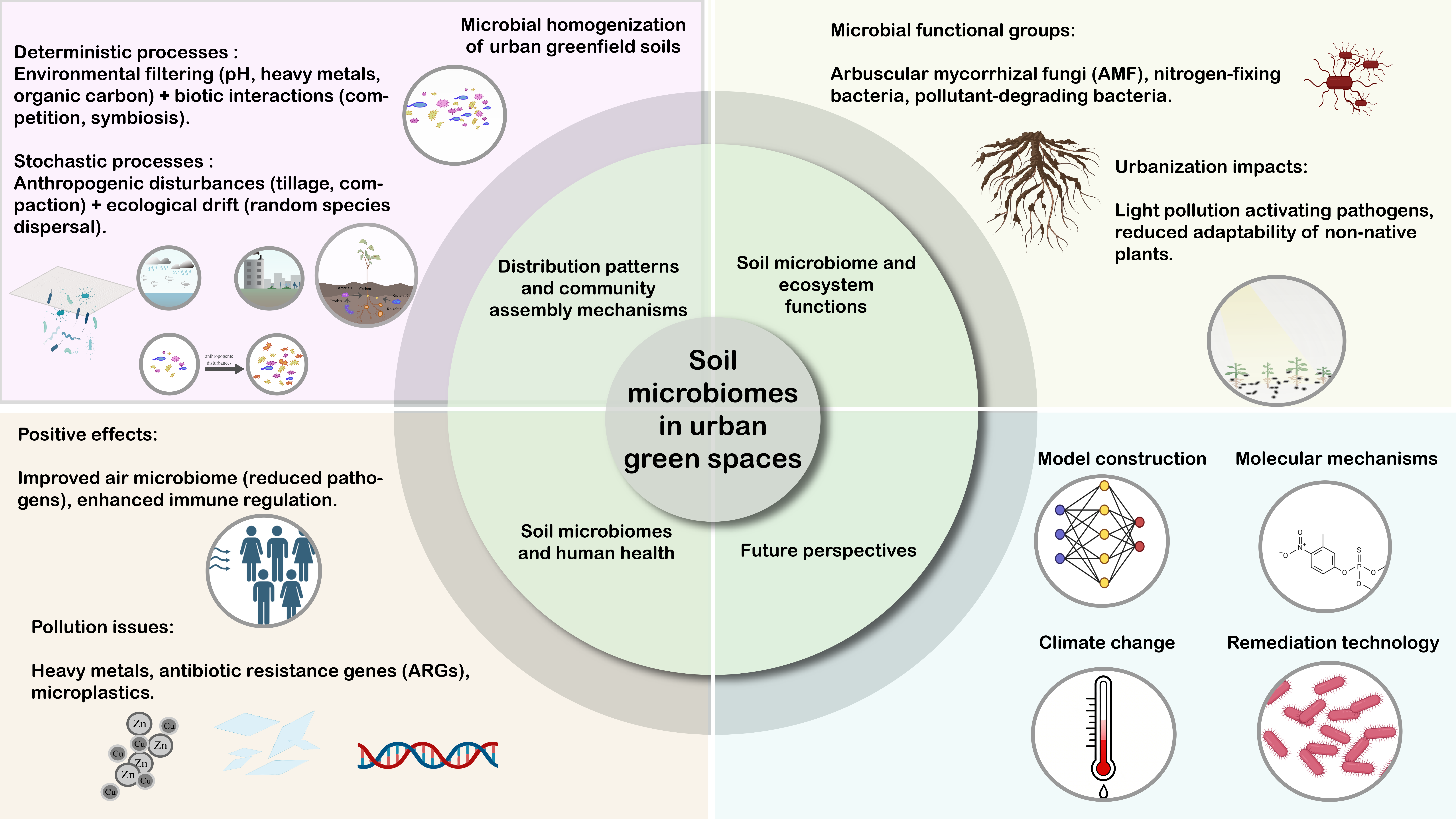 Soil microbiomes in urban green spaces (UGSs) critically influence the ecological functions, human health and sustainable development of one city. In the recent decade, the frequent concern of microorganisms in UGSs allow us to systematically review the research progress and focus the key questions for this field. We first summarized microbial major taxa and their distribution patterns in UGSs from local, regional and global scales, further identifying the main assembly mechanisms. We propose a three dimensional (3D) interactive framework “resource competition‒environmental filtering‒anthropogenic stress” that governs assembly of soil microbiomes in UGSs, and drives their homogenization. We then explore the relationship between UGSs soil microbiomes and critical ecosystem processes, including plant growth, carbon-nitrogen cycling and ecosystem stability. We also analyze the potential pathways through which UGSs soil microbiomes influence human health, including indirect impacts through regulating soil environmental quality, as well as direct involvement in human immune regulation. Future directions might be prioritized in monitoring soil microbiome dynamics, analyzing soil microbiome functional networks and constructing microbial-based strategies for synergistic optimization of UGSs ecology and public health.