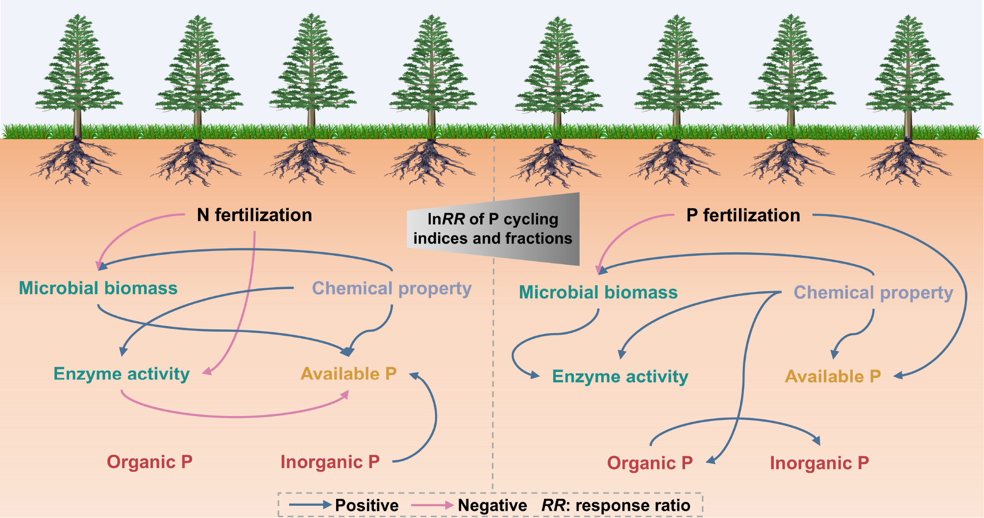 Soil phosphorus (P) availability is essential for forest productivity and stability, yet the long-term effects of nitrogen (N) and P fertilization on its mobilization remain unclear. To address this, we conducted a 10-year field experiment in Metasequoia glyptostroboides plantations under a subtropical monsoon climate, assessing the responses of soil chemical property, enzyme activity, microbial biomass, and P cycling indices and fractions to five independent levels each of N (0, 56, 168, 280, 336 kg ha−1) and P (0, 7.8, 31, 93, 155 kg ha−1) fertilization. P fertilization strongly increased available P and inorganic P fractions (Resin-Pi, NaHCO3-Pi, NaOH-Pi), while N fertilization had minimal direct effects. Under N fertilization, available P was primarily influenced by microbial biomass P and carbon, with NaOH-Pi as the dominant supply source. In contrast, under P fertilization, available P was regulated by total P, nitrate nitrogen, and organic carbon, with NaOH-Pi, NaOH-Po, NaHCO3-Pi, and NaHCO3-Po as key fractions. The direct effects of P fertilization, with a pathway coefficient of 0.37, slightly exceeded indirect effects. Overall, our decade-long fertilization trial shows that N fertilization sustains soil P availability chiefly through adaptive microbial processes, whereas P fertilization maintains it largely via direct nutrient inputs.