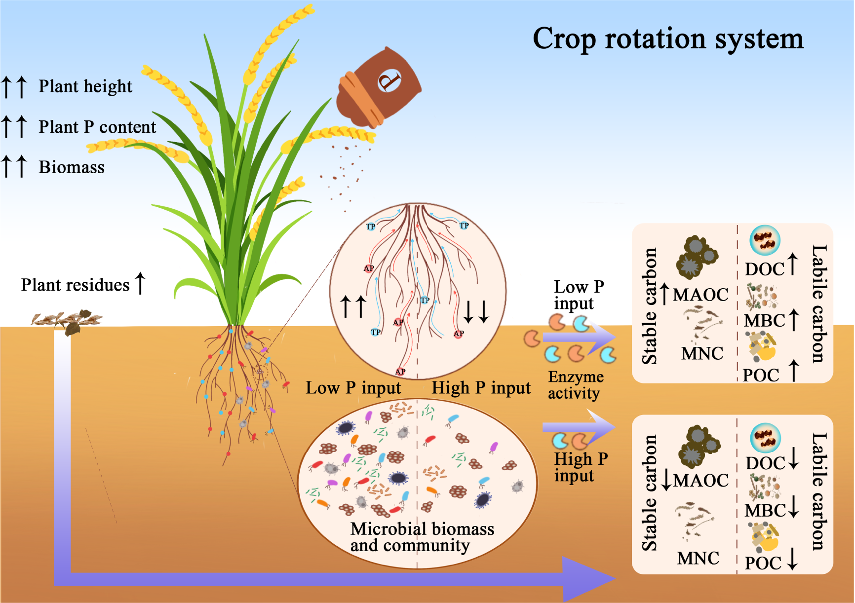 Understanding the effects of phosphorus (P) inputs on soil organic carbon (SOC) sequestration and their links with soil P dynamics is crucial for stabilizing food production and achieving the goal of C neutrality. To explore this, a global meta-analysis and a multi-year field experiment were conducted synchronously. The global dataset encompassing 352 paired observations indicated that P inputs significantly increased soil total P, available P, and SOC contents by 40.6%, 114.7%, and 10.6%, respectively, compared with the control. Increase of SOC was more pronounced in farmlands than in grasslands and forests, with the effects closely tied to P input levels. Meanwhile, field-based study showed that P inputs significantly increased paddy SOC accumulation, while excessive input weakened the benefit. Increased SOC accumulation was accompanied by an increase in most its sub-pools such as particulate organic C and microbial biomass C. These sub-pools notably declined when P input exceeded a critical threshold. The benefits in SOC and its sub-pools were strongly correlated with shifts in soil P availability, microbial biomass P, and phosphatase activity. These findings highlight the significance of P availability and dynamics in SOC accumulation and emphasize the need to define optimal P input thresholds to enhance SOC sequestration.