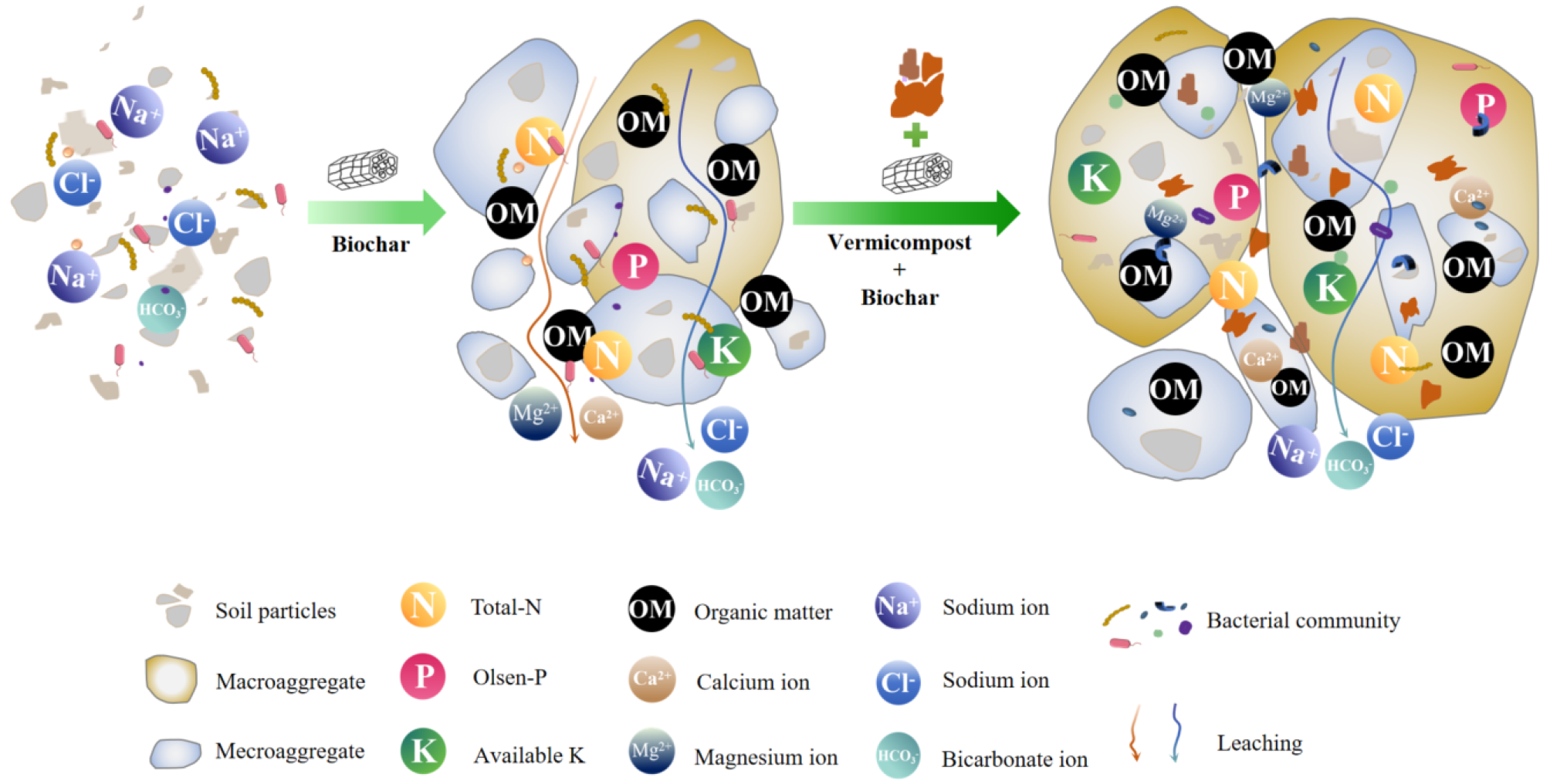 Coastal saline-alkali soils challenges global agricultural through high salinity, structural degradation, microbial dysfunction, and nutrient depletion. While biochar improves these soils’ physicochemical properties, its capacity to modulate soil microbial communities remains constrained. Therefore, we conducted a soil column experiment to investigate whether vermicompost, as a microbial inoculant can enhance biochar’s remediation efficacy in severely saline-alkali soils through biological reinforcement by enriching functional microbes capable of colonizing and interacting with biochar. Our results revealed that biochar incorporation significantly increased soil organic matter (+180.5%) and other nutrients compared to CK, with further enhancement via synergistic interactions with vermicompost. The vermicompost-supplemented biochar amendment treatment increased water-stable macroaggregates by 20.2% (approximately 2.2 times higher than the sole biochar treatment). The addition of biochar significantly reduced Na+, Cl−, HCO3− and SO42−, but resulted in a decrease in Mg2+ and Ca2+, while the presence of vermicompost could slow down this trend. Notably, the biochar-vermicompost co-application significantly affected soil bacterial communities by enriching microorganisms associated with carbon and nitrogen nutrient cycling, such as Filobacillus and Xanthobacteraceae. Taken together, these findings indicate that the biochar-vermicompost co-application reduced salt leaching and improves nutrient retention via soil aggregation restructuring, and further remediated saline-alkaline soils by boosting functional microbial communities.