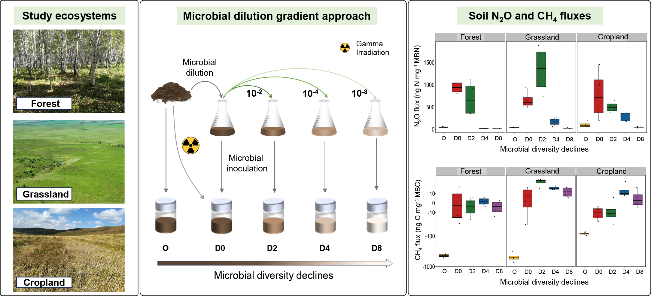 Loss of soil microbial diversity is accelerating worldwide, yet how this loss alters soil greenhouse gas fluxes remains poorly understood. Here, we provide experimental evidence that diversity loss affects nitrous oxide (N2O) and methane (CH4) fluxes through nonlinear, trait-mediated pathways. Using soil microcosm dilution gradients established across three land-use types (forest, grassland, and cropland), we linked shifts in community diversity with key physiological traits: carbon use efficiency (CUE), nitrogen use efficiency (NUE), and turnover rate. Over a 118-day incubation, soil N2O flux exhibited a pronounced hump-shaped response: moderate diversity loss stimulated emissions, whereas severe loss suppressed them through the breakdown of functional redundancy. Strikingly, even moderate diversity loss reversed soils from CH4 sinks to net sources. Microbial turnover consistently emerged as the core driver of both N2O and CH4 fluxes, with additional contributions from the turnover interactions with CUE and NUE. Variance partitioning further showed that microbial physiological traits explained 62% of CH4 flux variation and 59% of N2O flux variation. Together, these findings highlight the pivotal role of microbial traits in mediating soil biodiversity-function relationships. They also emphasize the importance of incorporating trait-based processes into Earth system models to improve predictions of soil climate feedbacks.