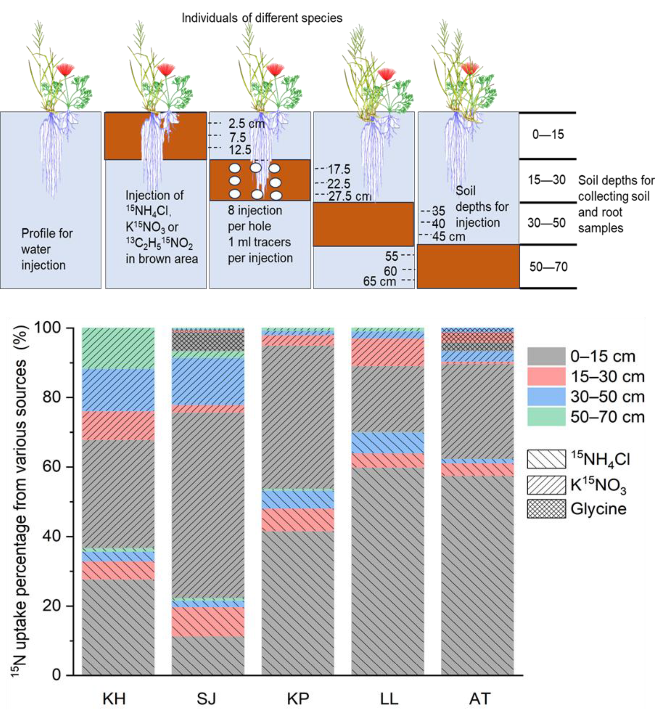 The uptake of permafrost thaw released nitrogen (N) could benefit plant growth and change vegetation community composition in a warming climate in cold regions. However, the capacity of co-existing species to take up different forms of available N beyond the root zone remains largely unknown in permafrost areas with a deep active layer. In situ 15NH4Cl, K15NO3 and C2H5NO2 (glycine) labelling were conducted up to 70 cm depth for five species. Averaged across the five species, the summed 15N recovery rate of the three tracers was 10.71% ± 10.69%, 1.69% ± 2.51%, 1.54% ± 4.16% and 0.7% ± 2.23% at 0‒15, 15‒30, 30‒50 and 50‒70 cm, respectively. Kobresia humilis had the largest N uptake diversity. The NO3‒-N recovered from 30‒70 cm for K. humilis and Saussurea japonica was much higher than other species, accounting for 23% and 13% of the total N recovered at 0‒70 cm. Root surface area was positively related to the recovery rate of inorganic N at soil below 15 cm whereas a species’ N requirement negatively to the N recovery at 0‒15 cm. The relative cover of a species in a community was negatively related to a species’ N requirement but showed no relationship with the N recovery rate or N uptake diversity. Plant communitycomposition may not be affected by vertical N uptake patterns of co-existing species. Species that can take up N from deep soil layers may gain competitive advantages, thereby altering the plant community structure in a warm climate in the future.