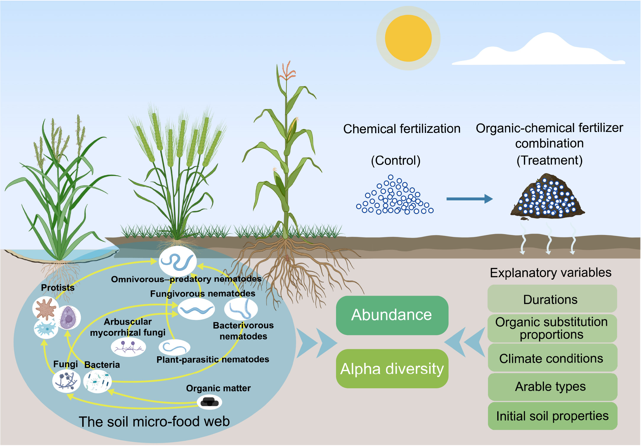 The excessive use of chemical fertilizers in agriculture has led to a decline in soil biodiversity. Organic fertilizer substitution has been proposed as a sustainable alternative toward the mitigation of these adverse effects, yet its impacts on the diversity of soil microbiota across varying environmental contexts remain poorly quantified. Here, we conducted a meta-analysis of 82 published studies from large-scale agricultural ecosystems. We revealed that organic fertilizer substitution significantly increased the abundances of bacteria, fungi, and nematodes, while enhancing the alpha diversity of bacterial and fungal communities. Specifically, the positive impacts on microbial abundance and alpha diversity became stronger over prolonged experimental timelines. The most potent effects on nematode abundance, arbuscular mycorrhizal fungi (AMF) richness, as well as bacterial Shannon and fungal Chao1 indices were observed under moderate substitution proportions (20%–50%). The stimulatory effects on the abundance and alpha diversity of bacteria and fungi were more pronounced in warm and humid climates, whereas the AMF Shannon index increased in colder regions. Moreover, the nematode Shannon index responded more strongly in drylands than in paddy fields. Collectively, our findings demonstrated that organic fertilizer substitution effectively rebuilt the complexity of the soil micro-food web. Consequently, we recommend a moderate substitution proportion of 20%–50% to maximize biodiversity gains in agricultural soils.