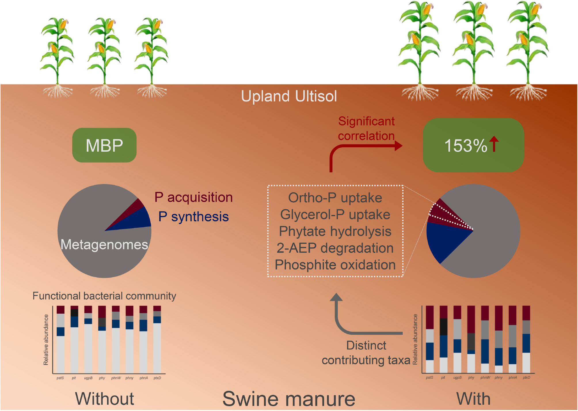 The application of livestock manure increases soil microbial biomass phosphorus (MBP), a highly bioavailable P pool, thereby enhancing soil P fertility and helping address global P challenges. However, it remains unclear how microbial communities adapt their P-acquisition strategies to sustain the elevated MBP, limiting a comprehensive understanding of the microbial mechanisms underlying this sustainable P management practice. This study investigated the relationship between soil MBP and microbial functional profiles of P transformation through metagenomic analysis at a long-term experimental site with repeated applications of swine manure. Manure fertilization significantly increased soil MBP by 153% and reshaped the composition of microbial P-transformation genes, with a significant increase in the normalized abundances of 85 out of the 135 detected genes. MBP was signifi-cantly and positively correlated with the metabolic potential for P-acquisition processes including orthophosphate uptake, phosphoglycerol uptake, phytate hydrolysis, 2-aminoethylphosphonic acid degradation, and phosphite oxidation. Distinct dominant genera were significantly enriched under manure fertilization among the bacterial communities involved in these critical P-acquisition processes. Solirubrobacter and Nocardioides were the shared enriched taxa and crucial for the stability of their corresponding communities. The considerable variation in copy numbers of the corresponding genes among the 56 reconstructed bacterial metagenome-assembled genomes was indicative of potential shifts in the functional capacity for the critical P-acquisition processes of the enriched taxa. Collectively, the findings of this study suggest the detailed adaptive P-acquisition strategies employed by soil microbial communities to maintain the elevated MBP under swine manure fertilization and the microbial taxa contributing to this adaptation.