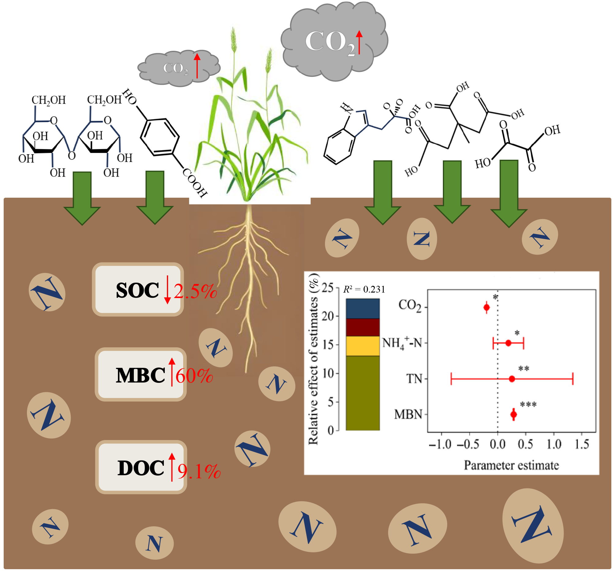 Nitrogen (N) deposition alters the composition and release of plant root exudates, thereby influencing the dynamics of soil organic carbon (SOC). However, the effects of specific root exudate compounds on SOC fractions under different N levels remain unclear. In this study, we conducted an incubation experiment to investigate how oxalic acid, citric acid, D-tryptophan, D(+) maltose, and p-hydroxybenzoic acid interact with different N addition levels (0, 90, 180, and 270 kg N ha−1) in affecting SOC fractions. The results revealed that N addition altered SOC through changes in soil physicochemical properties and microbial activity, reduced soil microbial biomass C, and increased CO2 emissions. The addition of root exudates resulted in an average 2.5% reduction in SOC. The interaction with N addition significantly (p < 0.05) increased soil microbial biomass C and dissolved organic C by 60% and 9.1%, respectively. Oxalic acid, citric acid, and p-hydroxybenzoic acid significantly (p < 0.05) stimulated greater CO2 release than D-tryptophan and D(+) maltose. Under N enrichment, root exudates influenced SOC dynamics primarily by regulating soil microbial biomass N. These findings highlight the interactive effects of N deposition and root exudate composition on soil C stability in agricultural ecosystems.