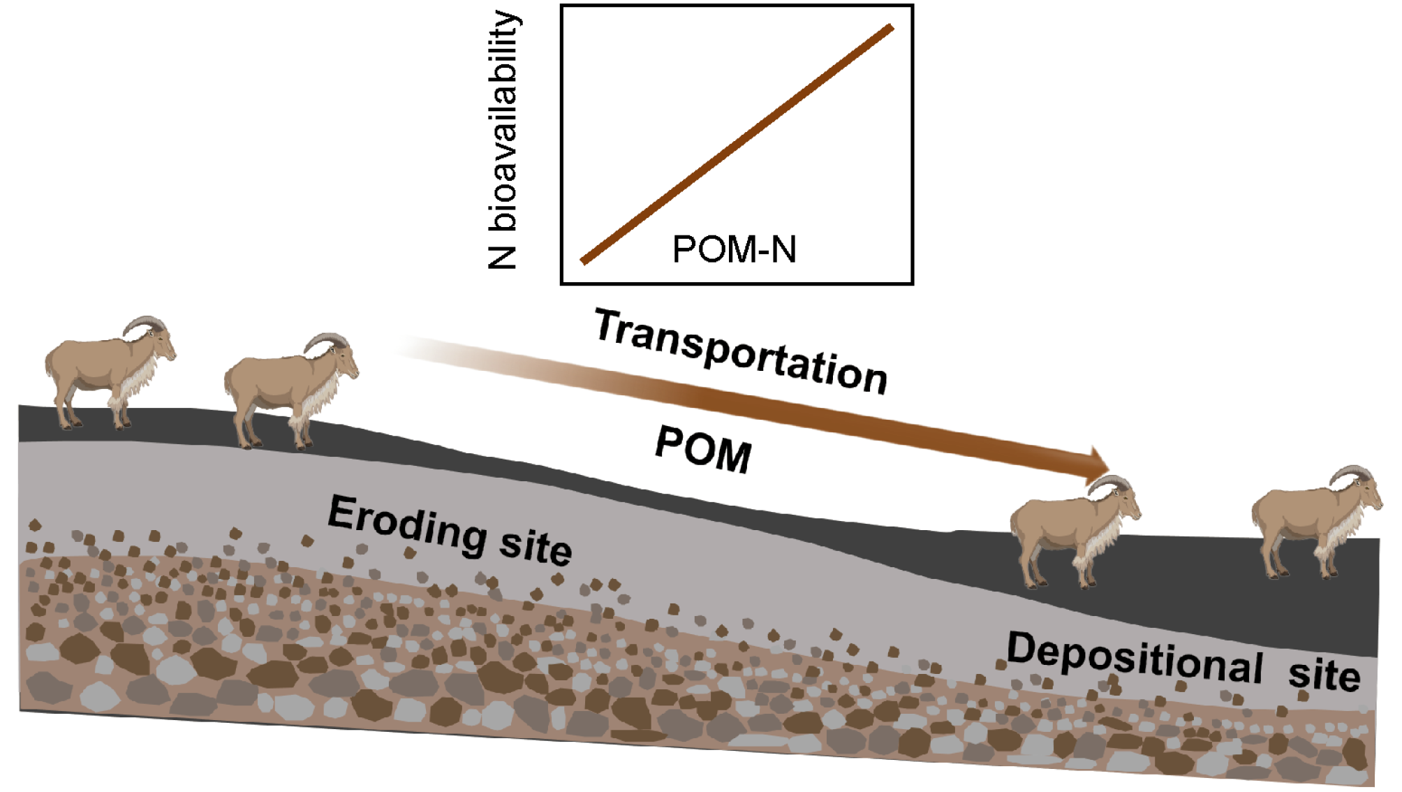 Although grazing and topography jointly regulate grassland ecosystem processes, the interactive influence of their effects on the spatial distribution of soil nitrogen (N) fractions and bioavailability remains unclear. Here, we sampled soils along three topographical positions (i.e., upper, middle, and down slope) in grazing and paired-adjacent enclosed (ungrazed) sites, respectively, in an Inner Mongolia hillslope grassland, and we measured N contents of particulate organic matter (POM-N) and mineral associated organic matter, and potential net N mineralization (Nm). Results showed that POM-N and Nm were, respectively, 174% and 1114% greater in the grazing site than in the enclosed grazing site in the 0–10 cm soil layer at the downslope position. Across the landscape of the grazing sites, POM-N and Nm were 1.79–2.03 and 2.82–6.83 times higher, respectively, in the downslope than in the upper and middle slope positions. Furthermore, POM-N showed a significantly positive correlation with the Nm. The results of this study indicate that grazing and erosion interactively drives the redistribution of POM along the slope by promoting plant residue fragmentation and soil materials movement, thereby reshaping the pattern of soil nitrogen cycling at the landscape scale.