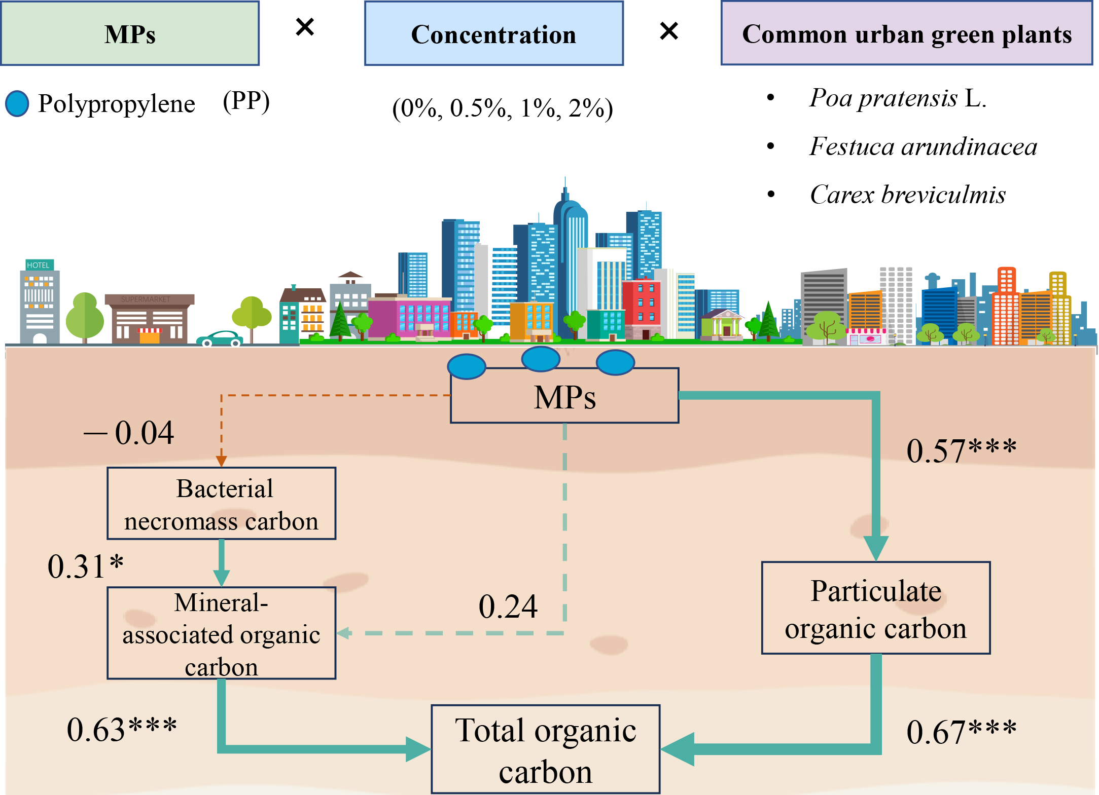 The pollution of microplastics (MPs) in terrestrial ecosystems has drawn growing concern. Nevertheless, the influence of MPs on the fractions of soil organic carbon (SOC), particularly in urban soils, is still not well understood. Particulate organic carbon (POC) as a key component of urban soil organic carbon, is a core element for maintaining the functions of urban soil ecosystems. The effect of MPs on soil carbon dynamics was investigated by exposing soils planted with three common green plants to polypropylene microplastics (MPs) at concentrations of 0%, 0.5%, 1%, and 2% (w/w). The addition of MPs resulted in an 18.6% to 48.2% increase in SOC content. MPs notably boosted POC content by 44.2% to 101.7%, while they only increased mineral-associated organic carbon (MAOC) in soil without plants, with a range of 41.8% to 54.7%. There was a significant negative correlation between SOC and bacterial necromass carbon (BNC) in the absence of MPs, but this negative correlation disappeared with the addition of MPs. Compared with the BNC, the fungal necromass carbon (FNC) mainly contributed to the microbial necromass carbon (MNC) (about 74.6%). Bacterial communities were more sensitive to the addition of MPs than fungal communities. Structural equation model confirmed that MPs addition increases SOC content by promoting the accumulation of POC and BNC contribute to MAOC. Overall, the findings highlight the sensitive response of POC to MPs pollution, which could have a potential effect on soil carbon components in urban soil.