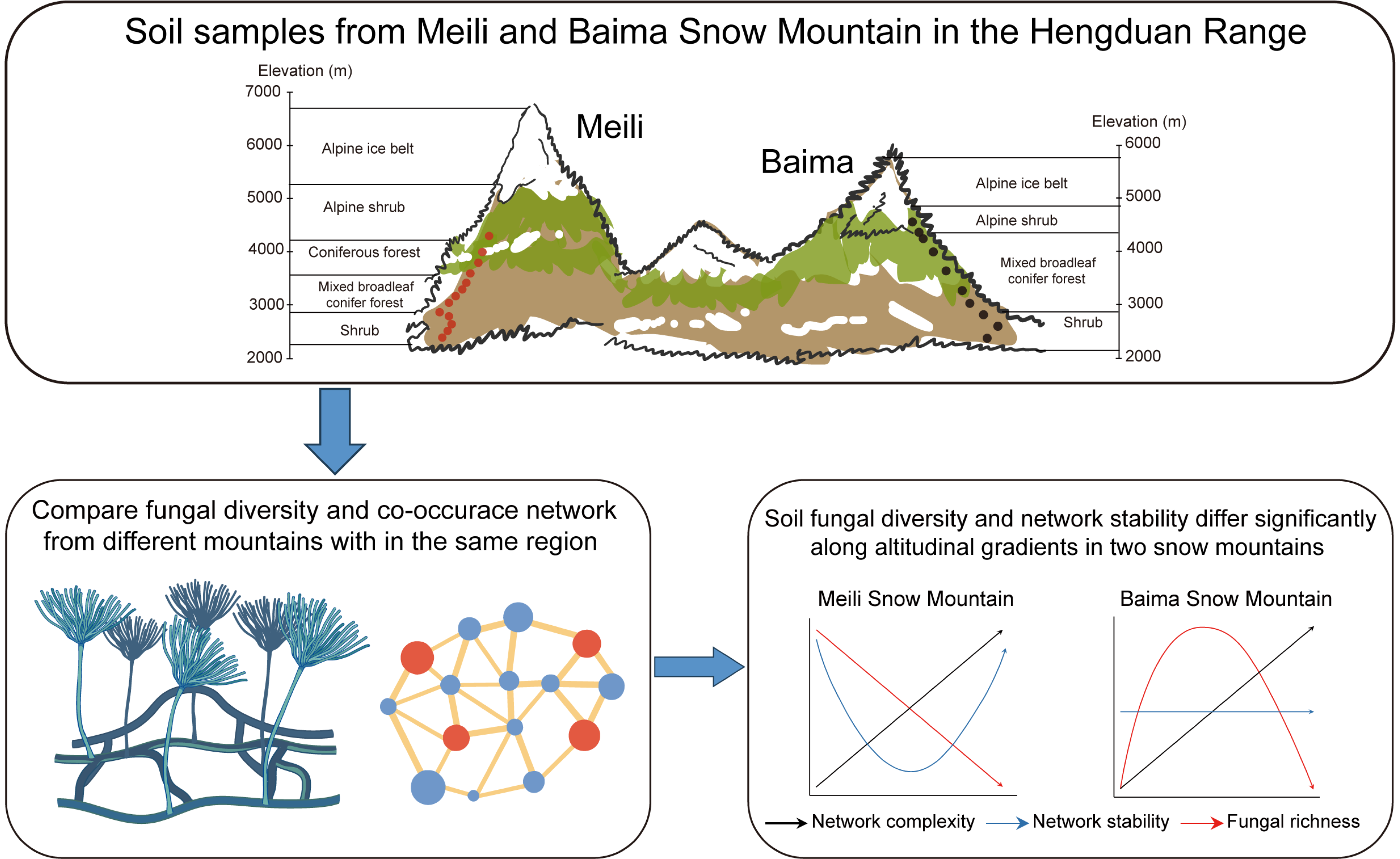 Distribution patterns and driving forces of soil fungal communities along elevational gradients on two snow mountains in the Hengduan Mountain Range